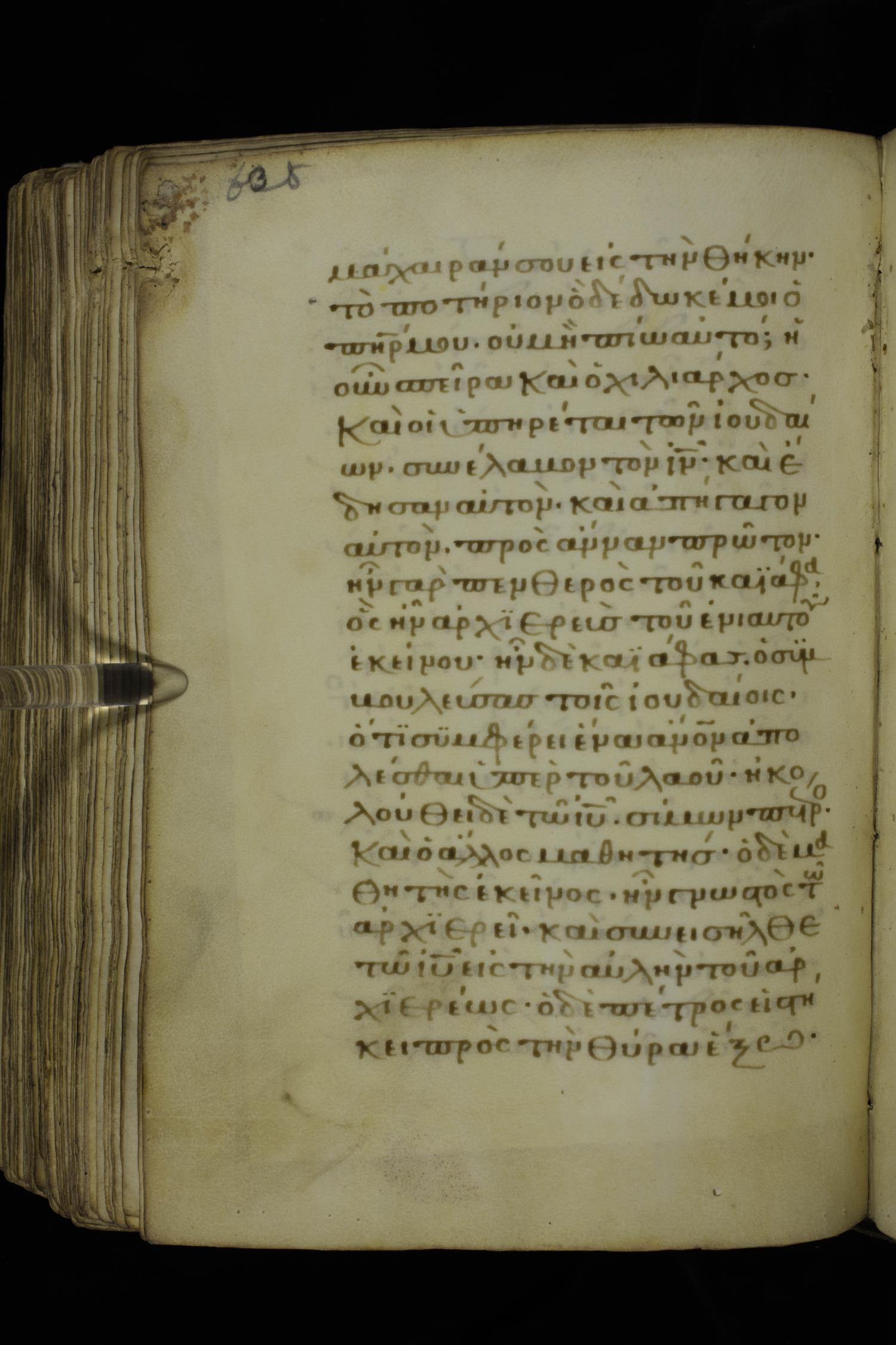 Fourteenth century minuscule of the Gospels on parchment; 332 leaves, 1 column, 21 lines per column. Images were taken at the National Library of Greece in Athens.