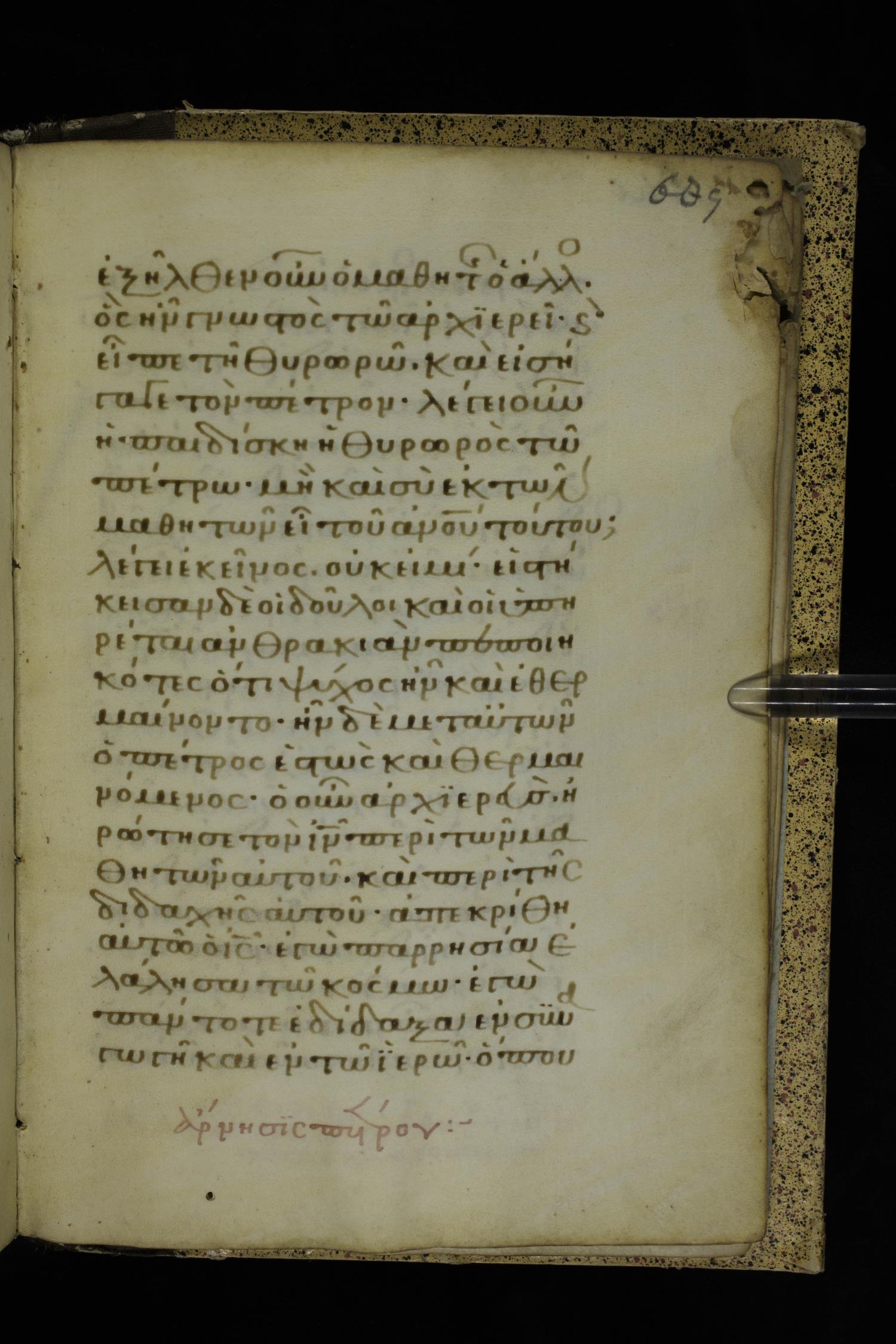 Fourteenth century minuscule of the Gospels on parchment; 332 leaves, 1 column, 21 lines per column. Images were taken at the National Library of Greece in Athens.