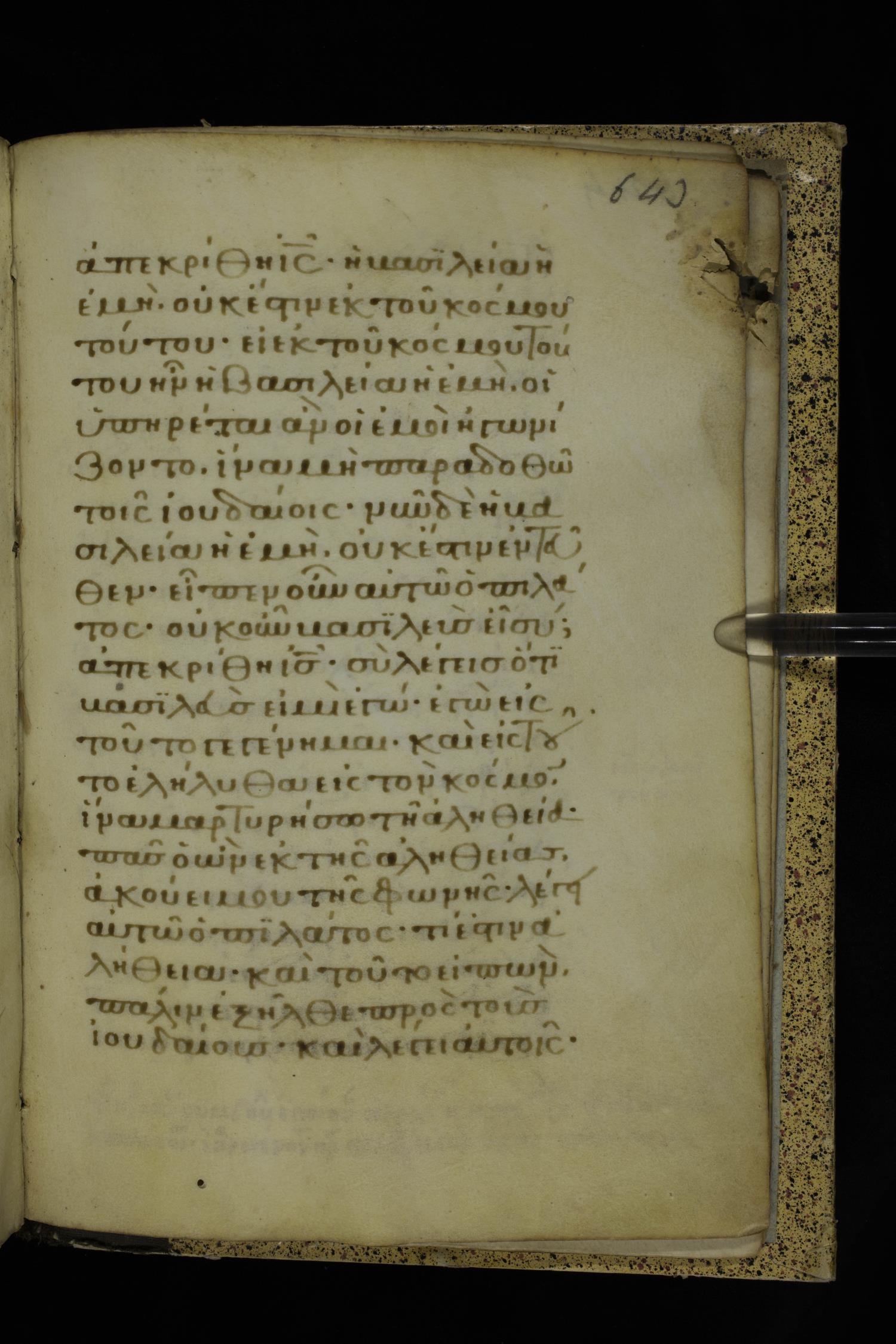 Fourteenth century minuscule of the Gospels on parchment; 332 leaves, 1 column, 21 lines per column. Images were taken at the National Library of Greece in Athens.