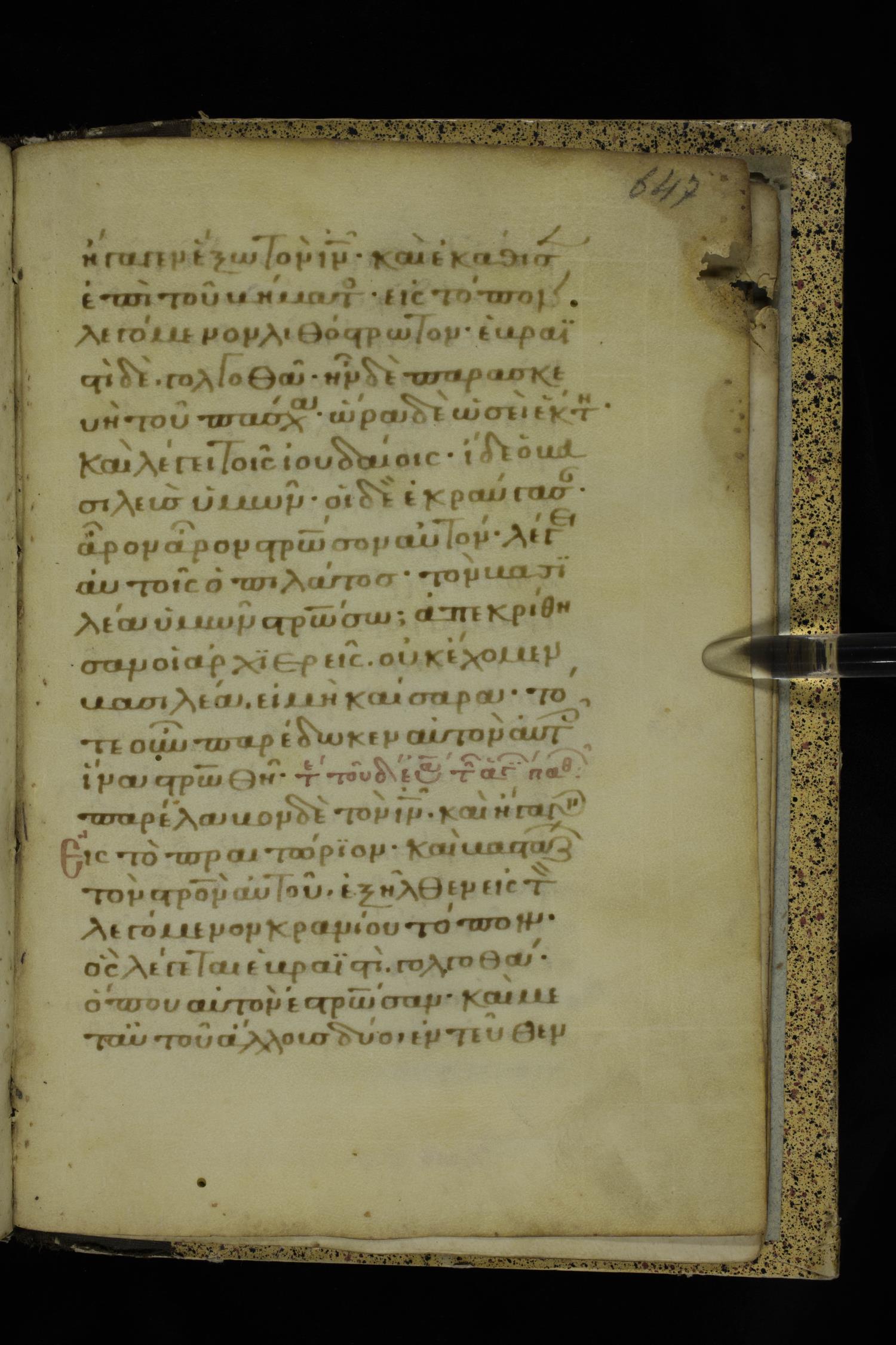 Fourteenth century minuscule of the Gospels on parchment; 332 leaves, 1 column, 21 lines per column. Images were taken at the National Library of Greece in Athens.