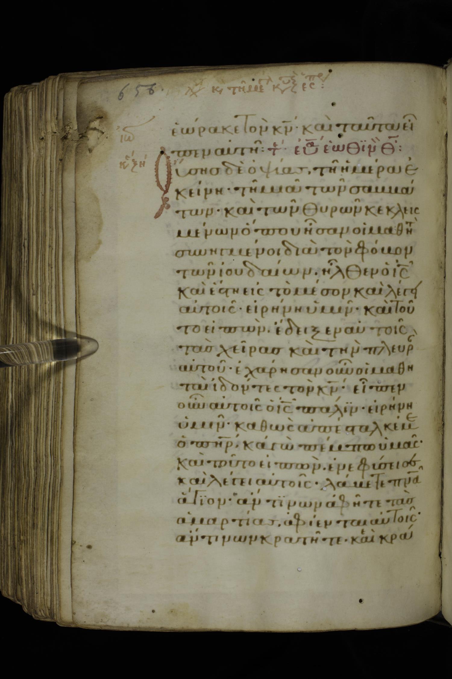 Fourteenth century minuscule of the Gospels on parchment; 332 leaves, 1 column, 21 lines per column. Images were taken at the National Library of Greece in Athens.
