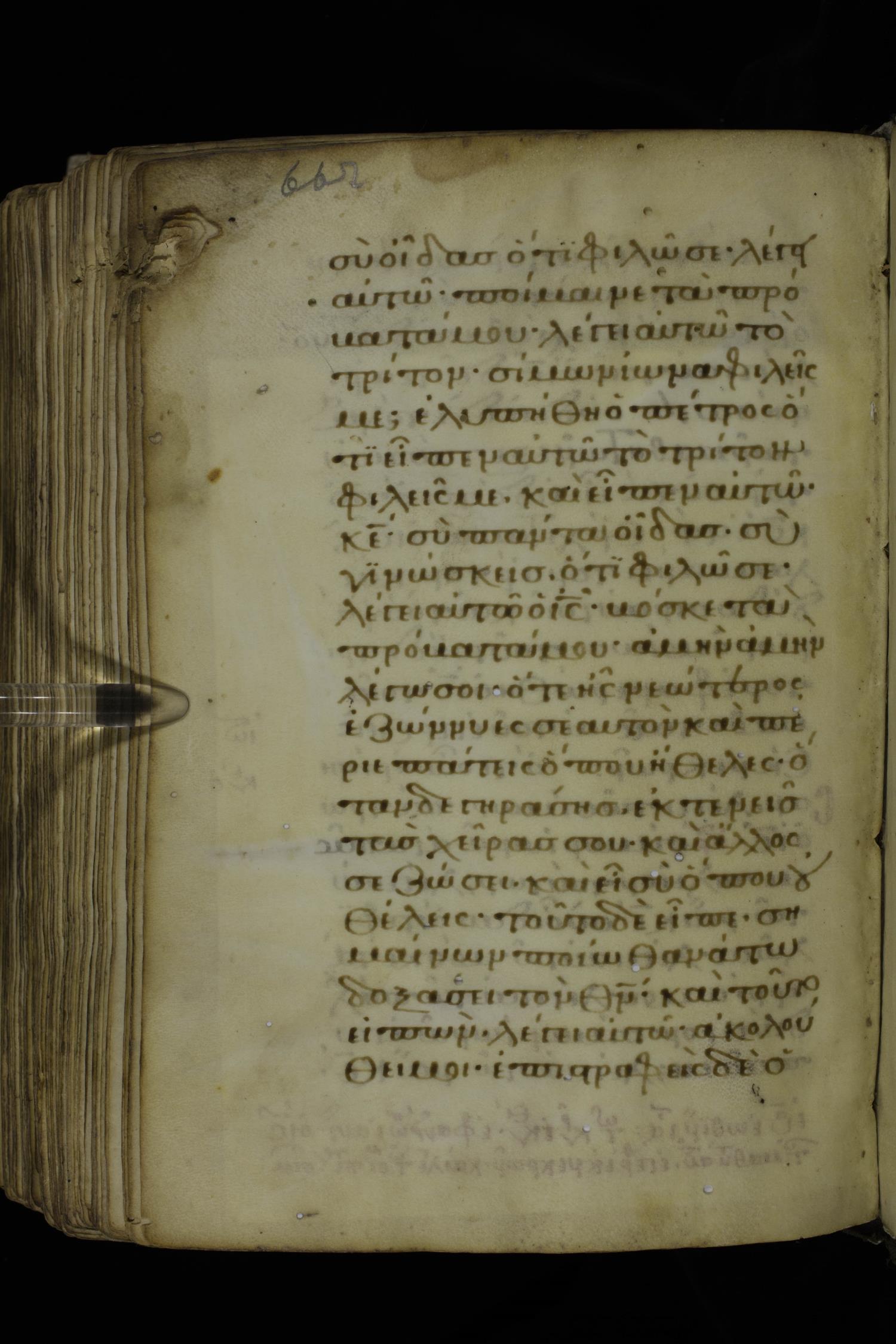 λέγει αὐτῷ τὸ τρίτον Σίμων Ἰωάνου / Ἰωάννου, φιλεῖς με; ἐλυπήθη ὁ Πέτρος ὅτι εἶπεν αὐτῷ τὸ τρίτον Φιλεῖς με; καὶ εἶπεν / λέγει αὐτῷ Κύριε, πάντα σὺ οἶδας, σὺ γινώσκεις ὅτι φιλῶ σε. λέγει αὐτῷ {ὁ} Ἰησοῦς Βόσκε τὰ προβάτιά / πρόβατά μου.