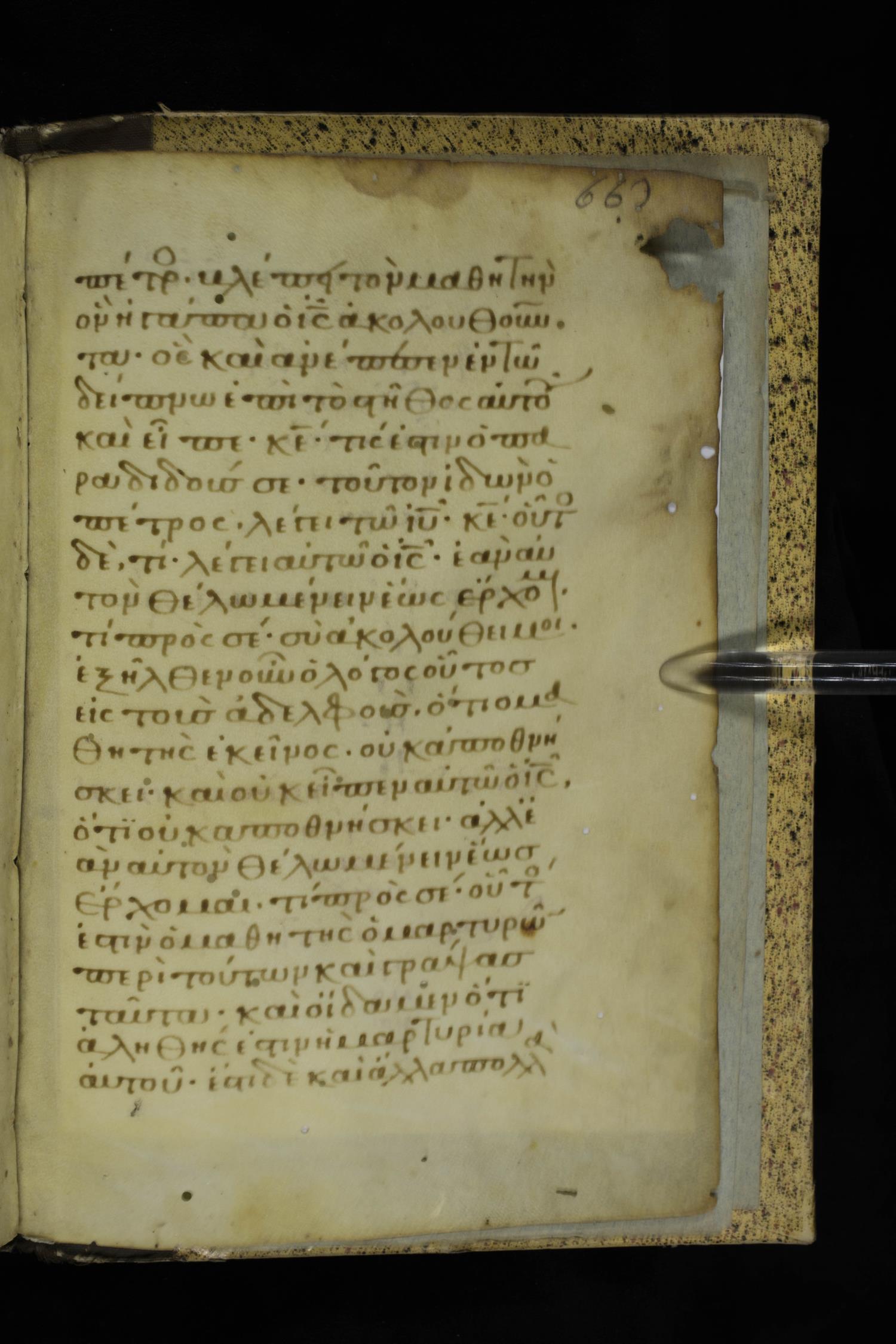 Fourteenth century minuscule of the Gospels on parchment; 332 leaves, 1 column, 21 lines per column. Images were taken at the National Library of Greece in Athens.