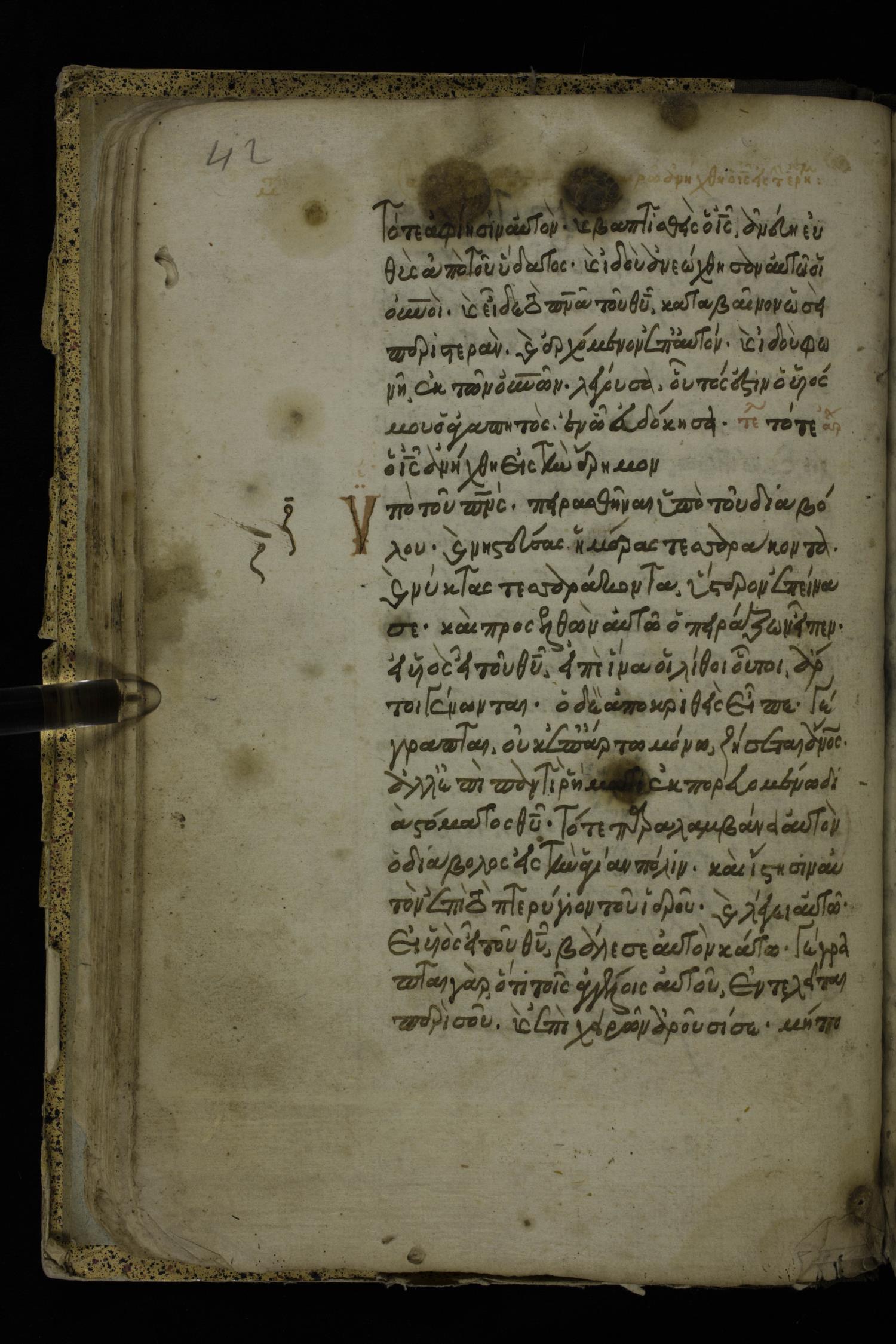 Fourteenth century minuscule of the Gospels on parchment; 324 leaves, 1 column, 21 lines per column. Images were taken at the National Library of Greece in Athens.