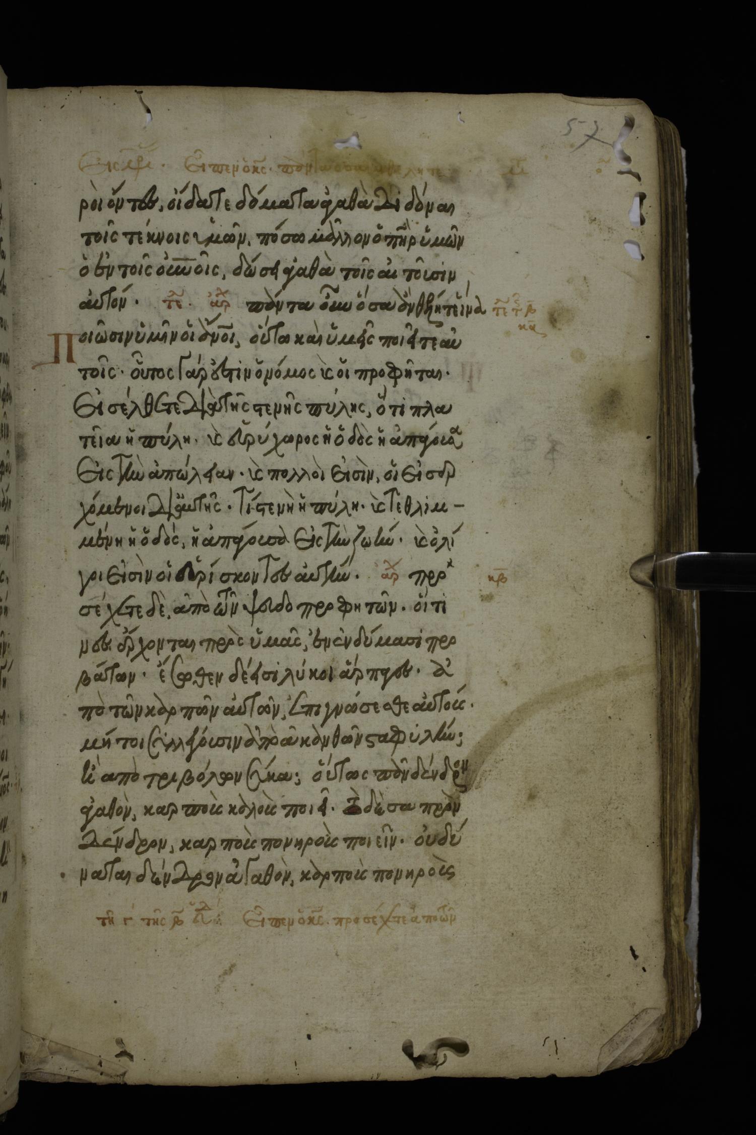 Fourteenth century minuscule of the Gospels on parchment; 324 leaves, 1 column, 21 lines per column. Images were taken at the National Library of Greece in Athens.