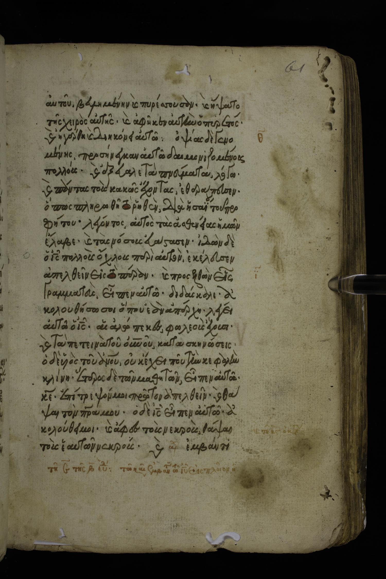 Fourteenth century minuscule of the Gospels on parchment; 324 leaves, 1 column, 21 lines per column. Images were taken at the National Library of Greece in Athens.