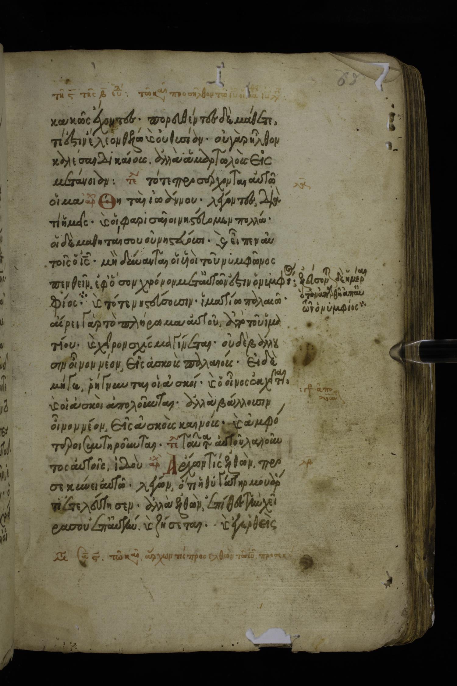 Fourteenth century minuscule of the Gospels on parchment; 324 leaves, 1 column, 21 lines per column. Images were taken at the National Library of Greece in Athens.