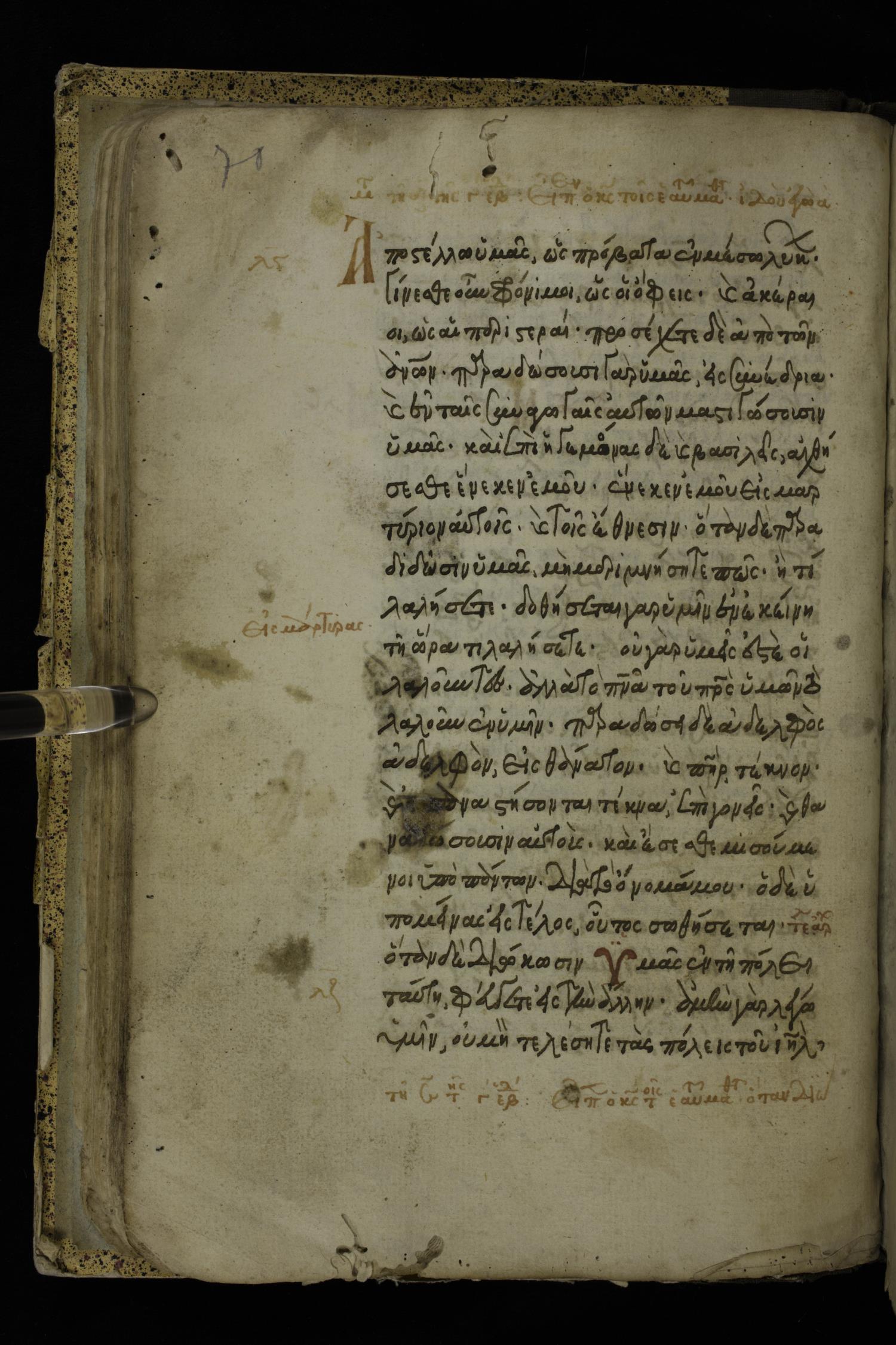 Fourteenth century minuscule of the Gospels on parchment; 324 leaves, 1 column, 21 lines per column. Images were taken at the National Library of Greece in Athens.