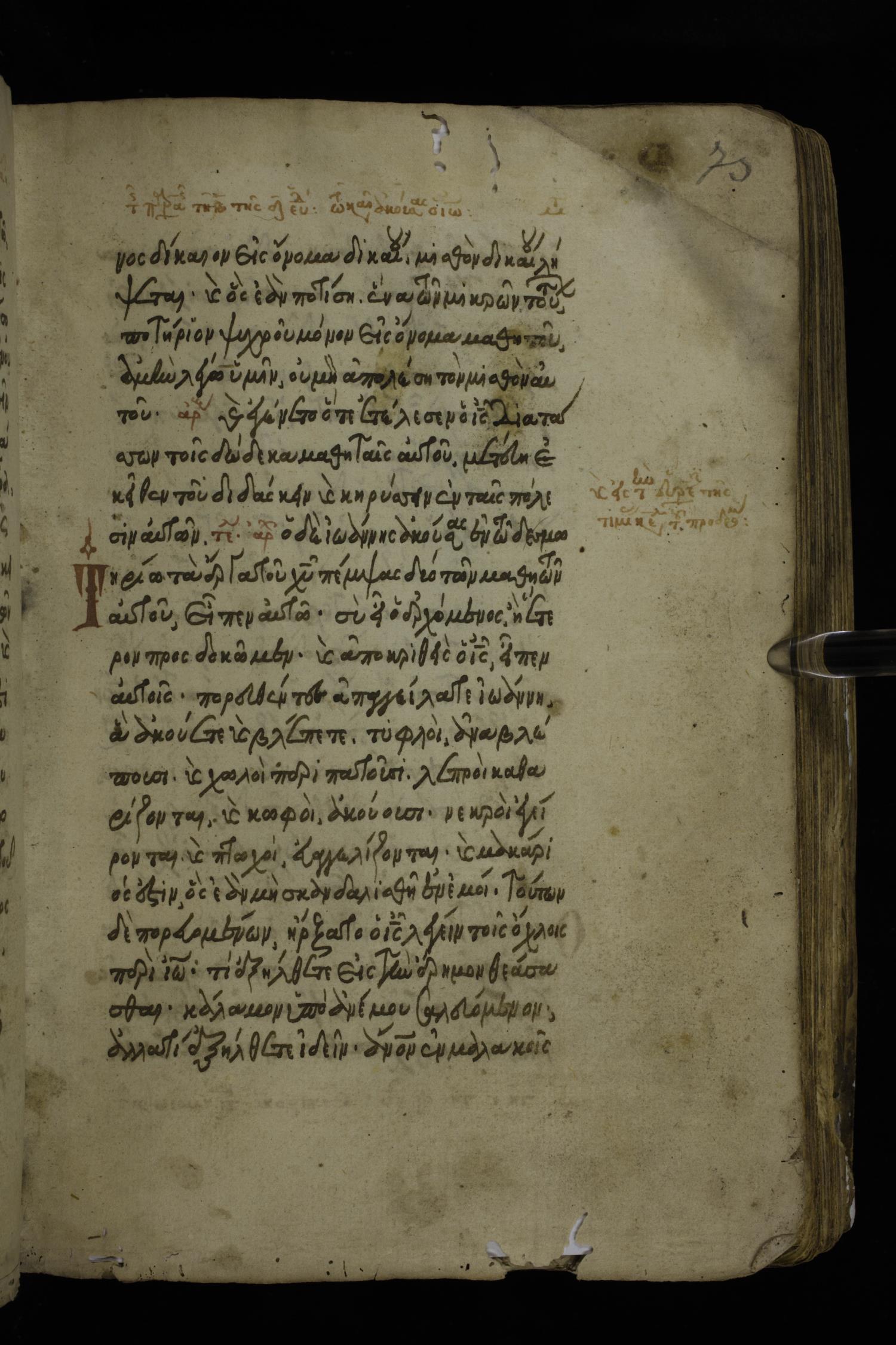 Fourteenth century minuscule of the Gospels on parchment; 324 leaves, 1 column, 21 lines per column. Images were taken at the National Library of Greece in Athens.