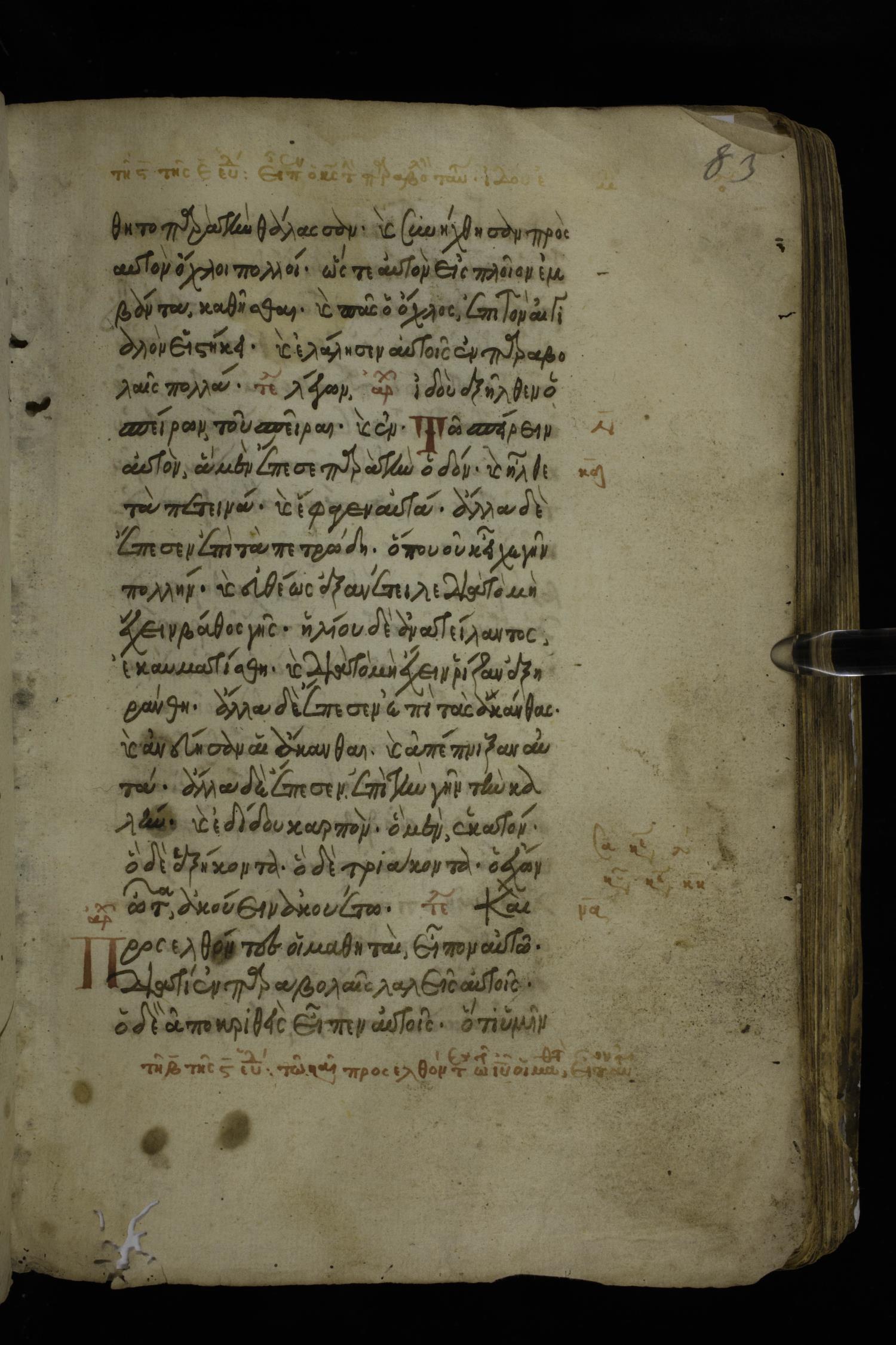 Fourteenth century minuscule of the Gospels on parchment; 324 leaves, 1 column, 21 lines per column. Images were taken at the National Library of Greece in Athens.
