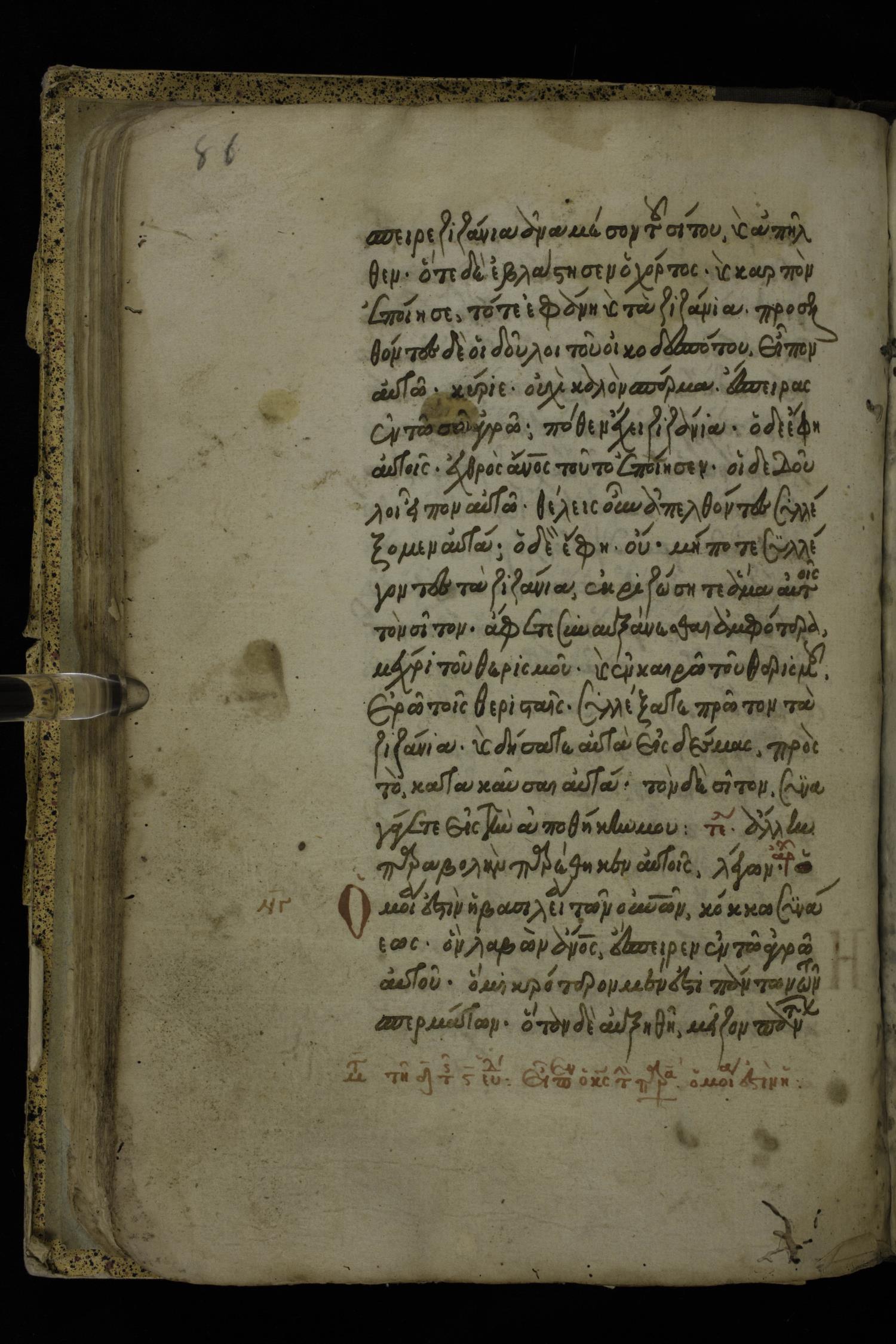 Fourteenth century minuscule of the Gospels on parchment; 324 leaves, 1 column, 21 lines per column. Images were taken at the National Library of Greece in Athens.