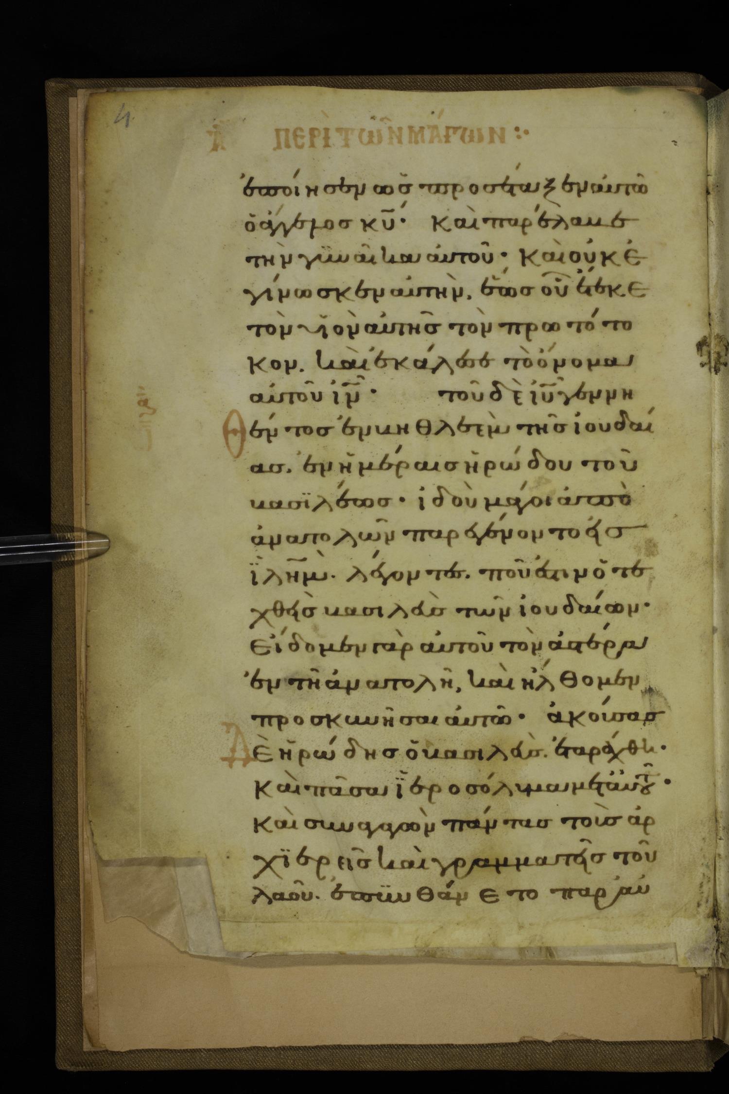 Fourteenth century minuscule of the Gospels on parchment; 332 leaves, 1 column, 20-22 lines per column. Images were taken at the National Library of Greece in Athens.