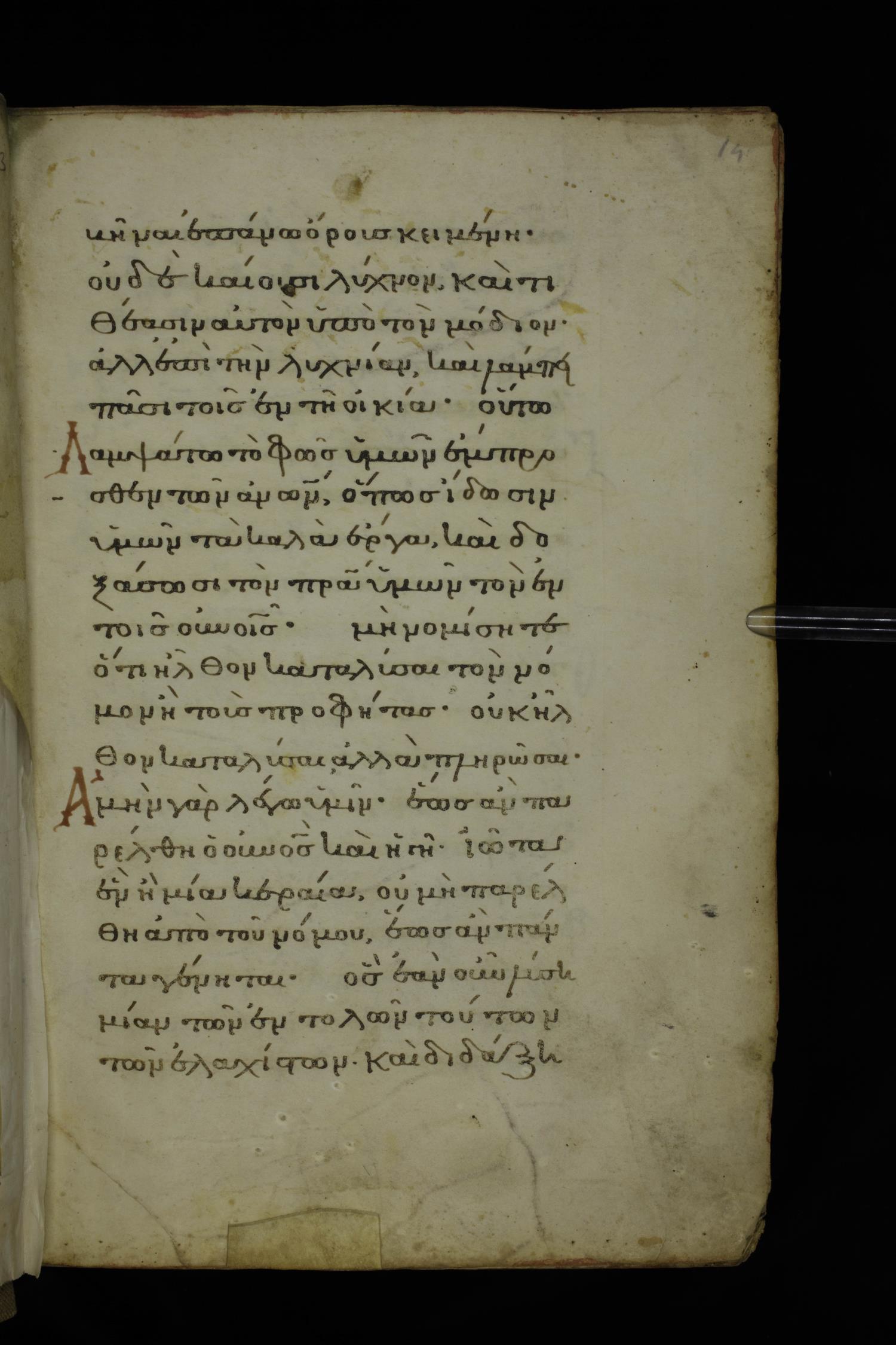 Fourteenth century minuscule of the Gospels on parchment; 332 leaves, 1 column, 20-22 lines per column. Images were taken at the National Library of Greece in Athens.