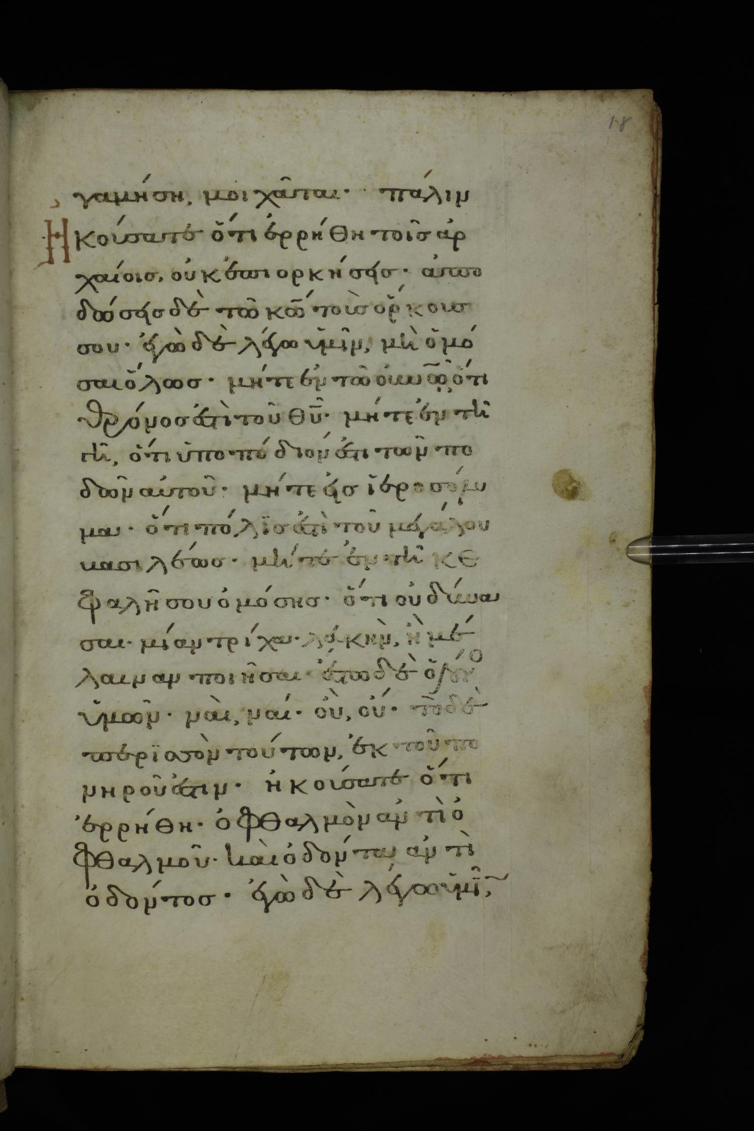 Fourteenth century minuscule of the Gospels on parchment; 332 leaves, 1 column, 20-22 lines per column. Images were taken at the National Library of Greece in Athens.