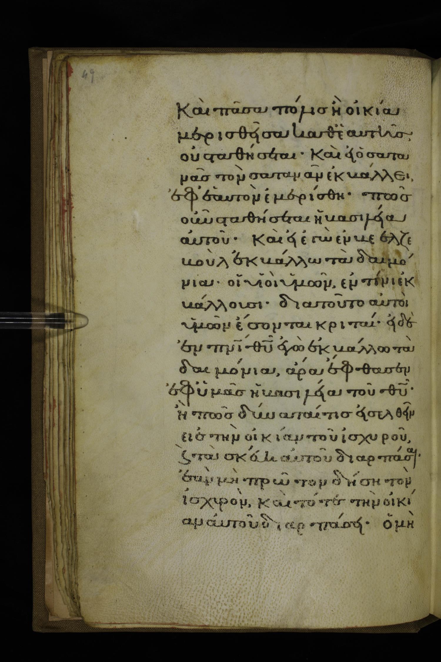 ἢ πῶς δύναταί τις εἰσελθεῖν εἰς τὴν οἰκίαν τοῦ ἰσχυροῦ καὶ τὰ σκεύη αὐτοῦ ἁρπάσαι, ἐὰν μὴ πρῶτον δήσῃ τὸν ἰσχυρόν; καὶ τότε τὴν οἰκίαν αὐτοῦ διαρπάσει.