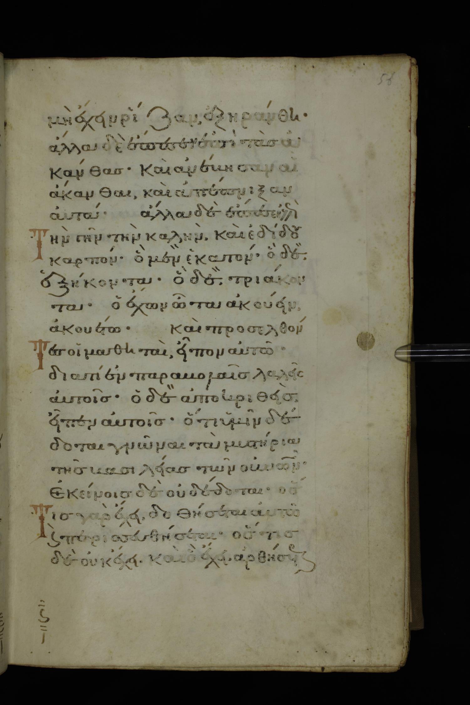 Fourteenth century minuscule of the Gospels on parchment; 332 leaves, 1 column, 20-22 lines per column. Images were taken at the National Library of Greece in Athens.