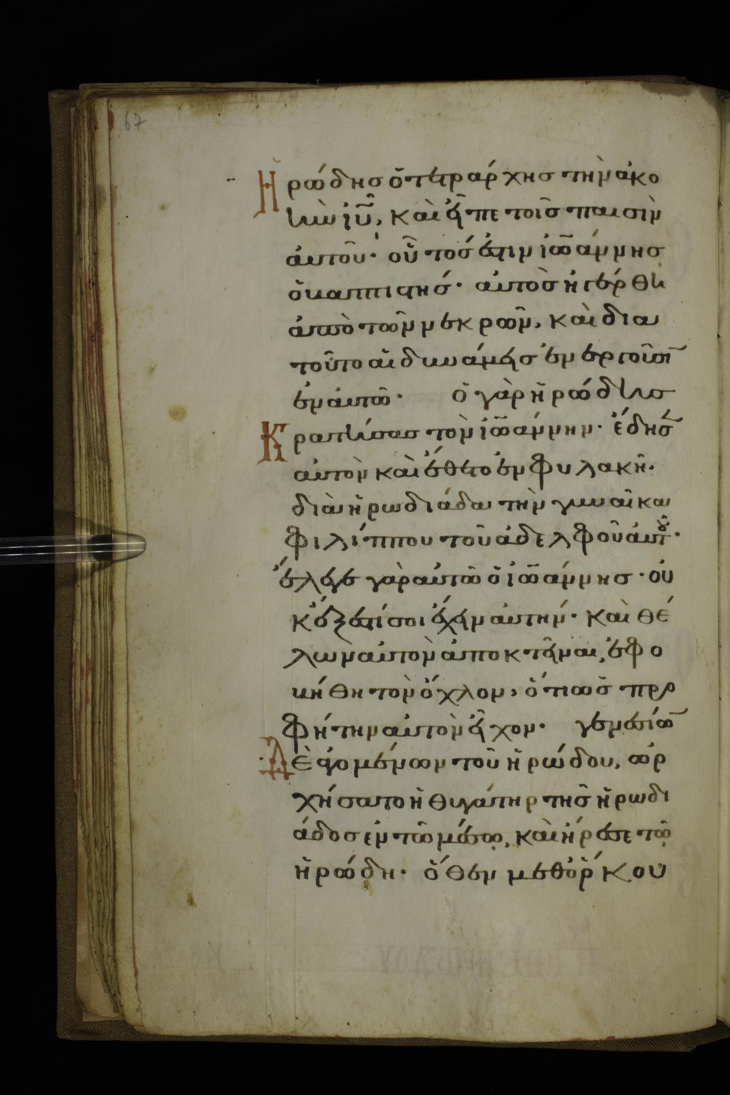 Fourteenth century minuscule of the Gospels on parchment; 332 leaves, 1 column, 20-22 lines per column. Images were taken at the National Library of Greece in Athens.