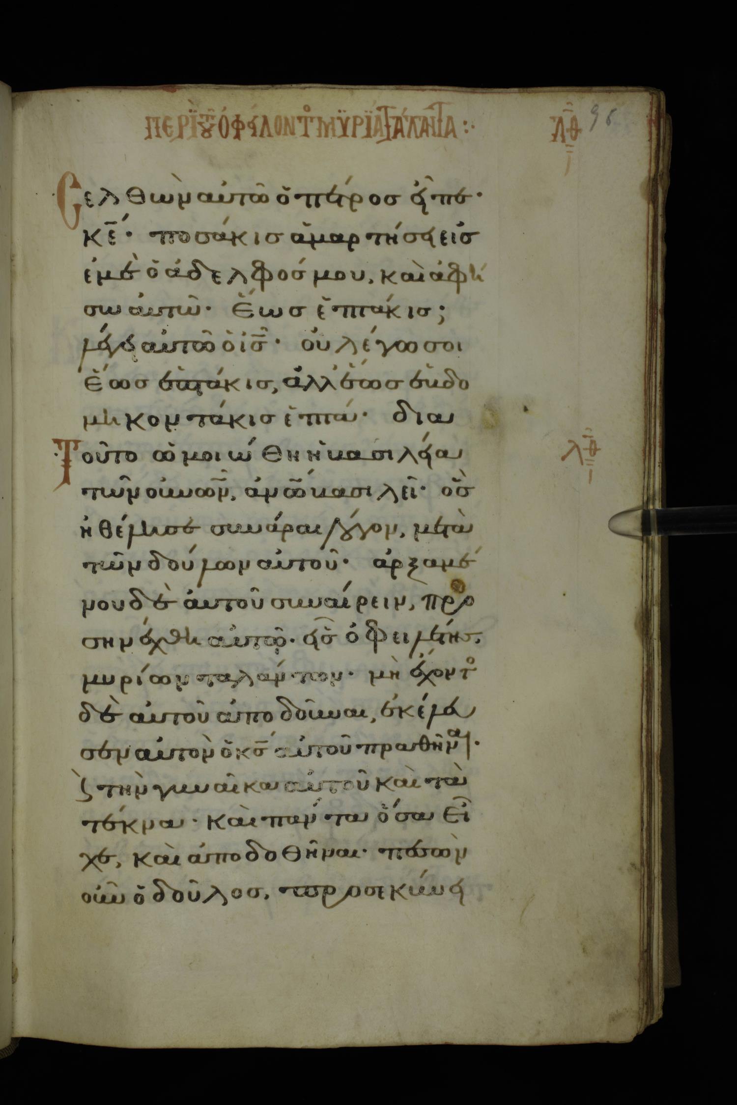 Fourteenth century minuscule of the Gospels on parchment; 332 leaves, 1 column, 20-22 lines per column. Images were taken at the National Library of Greece in Athens.