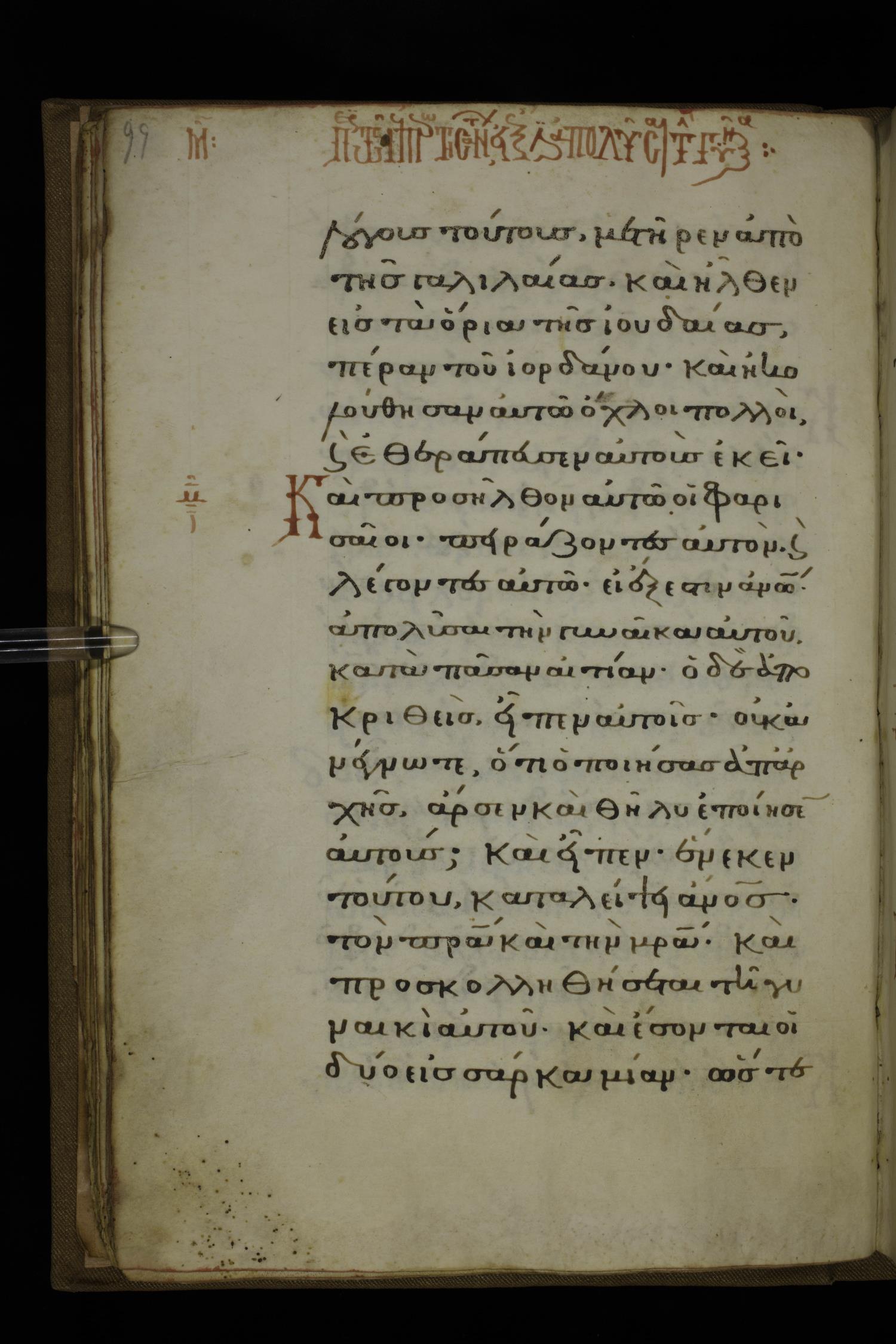 Fourteenth century minuscule of the Gospels on parchment; 332 leaves, 1 column, 20-22 lines per column. Images were taken at the National Library of Greece in Athens.