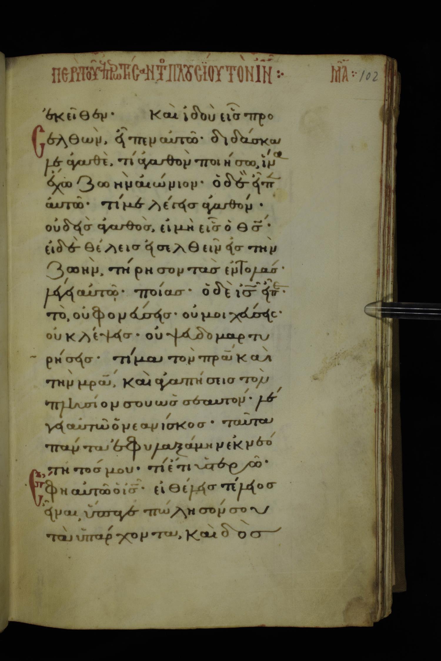 Fourteenth century minuscule of the Gospels on parchment; 332 leaves, 1 column, 20-22 lines per column. Images were taken at the National Library of Greece in Athens.