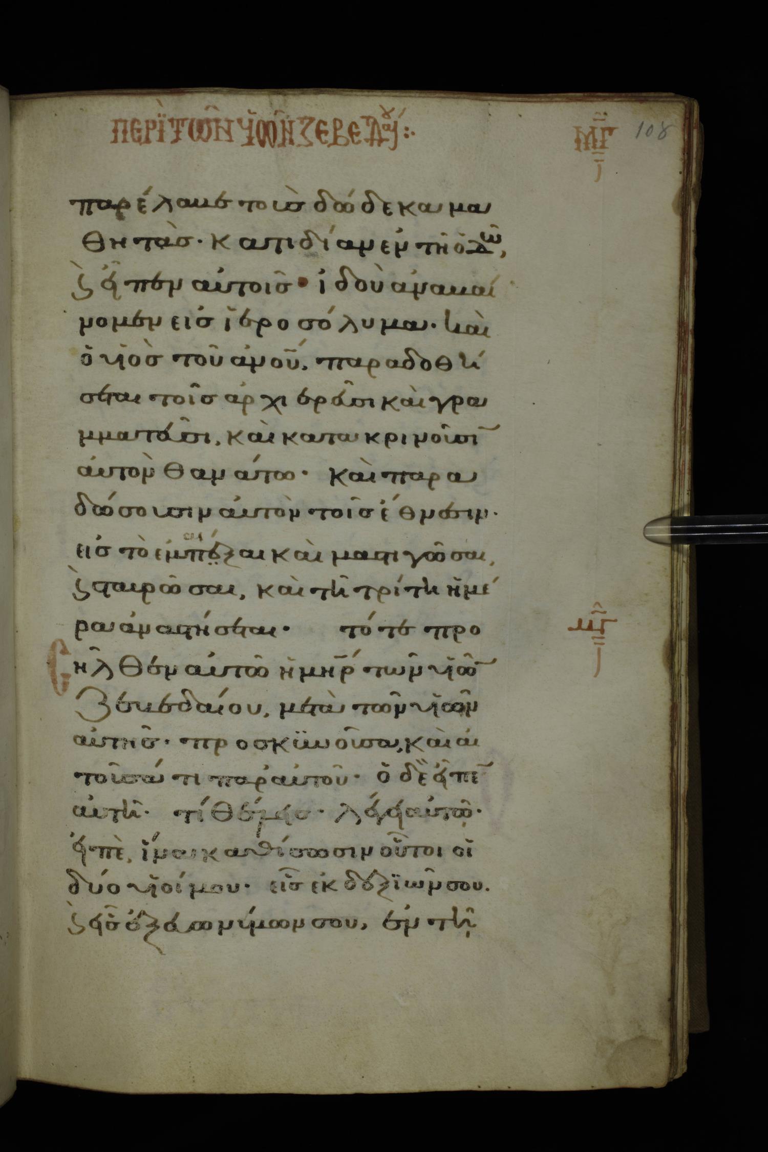 Fourteenth century minuscule of the Gospels on parchment; 332 leaves, 1 column, 20-22 lines per column. Images were taken at the National Library of Greece in Athens.