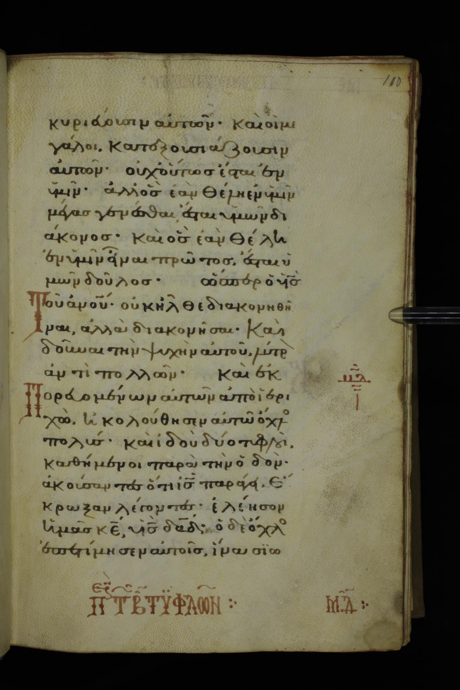 Fourteenth century minuscule of the Gospels on parchment; 332 leaves, 1 column, 20-22 lines per column. Images were taken at the National Library of Greece in Athens.