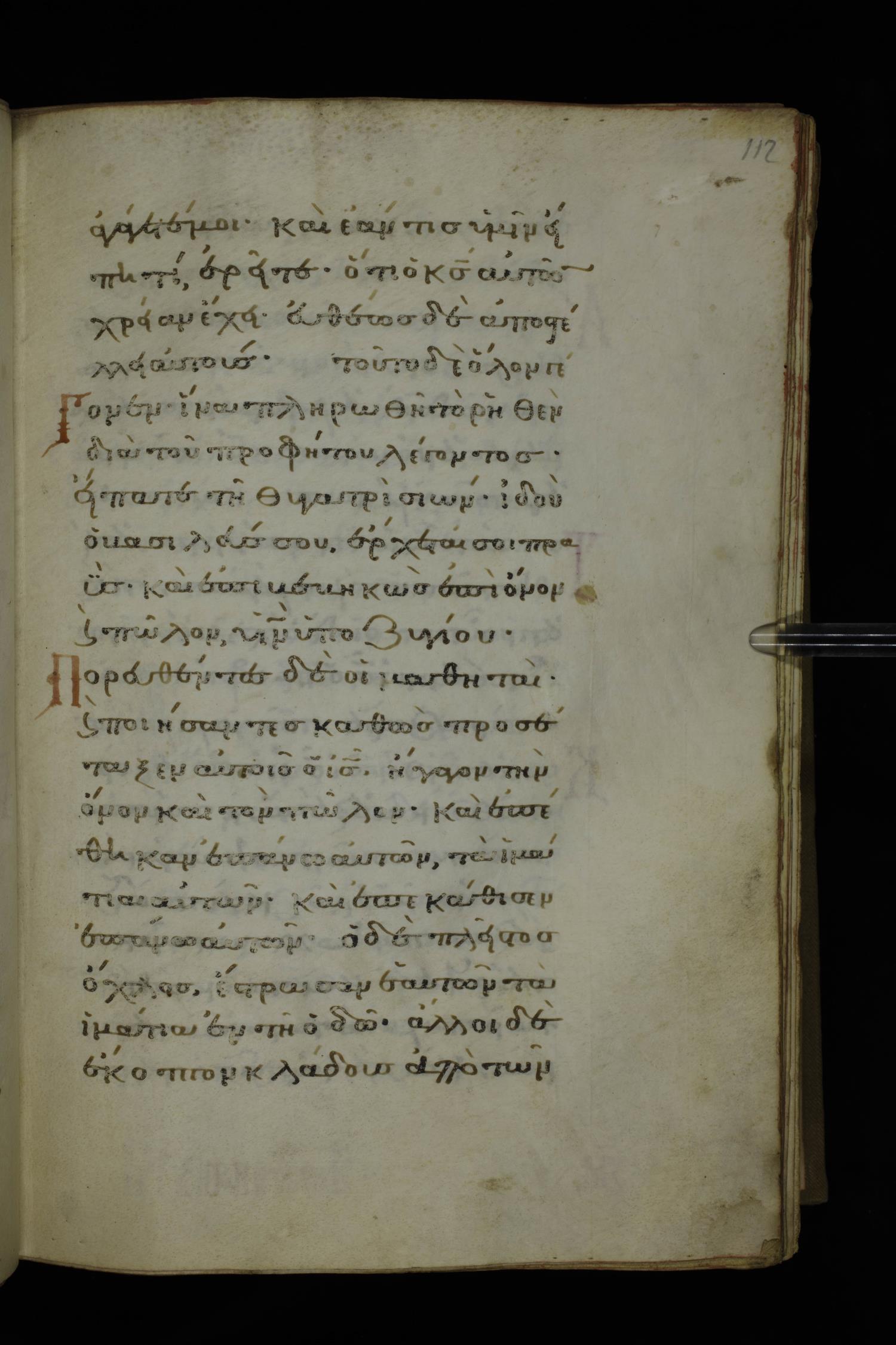 Fourteenth century minuscule of the Gospels on parchment; 332 leaves, 1 column, 20-22 lines per column. Images were taken at the National Library of Greece in Athens.