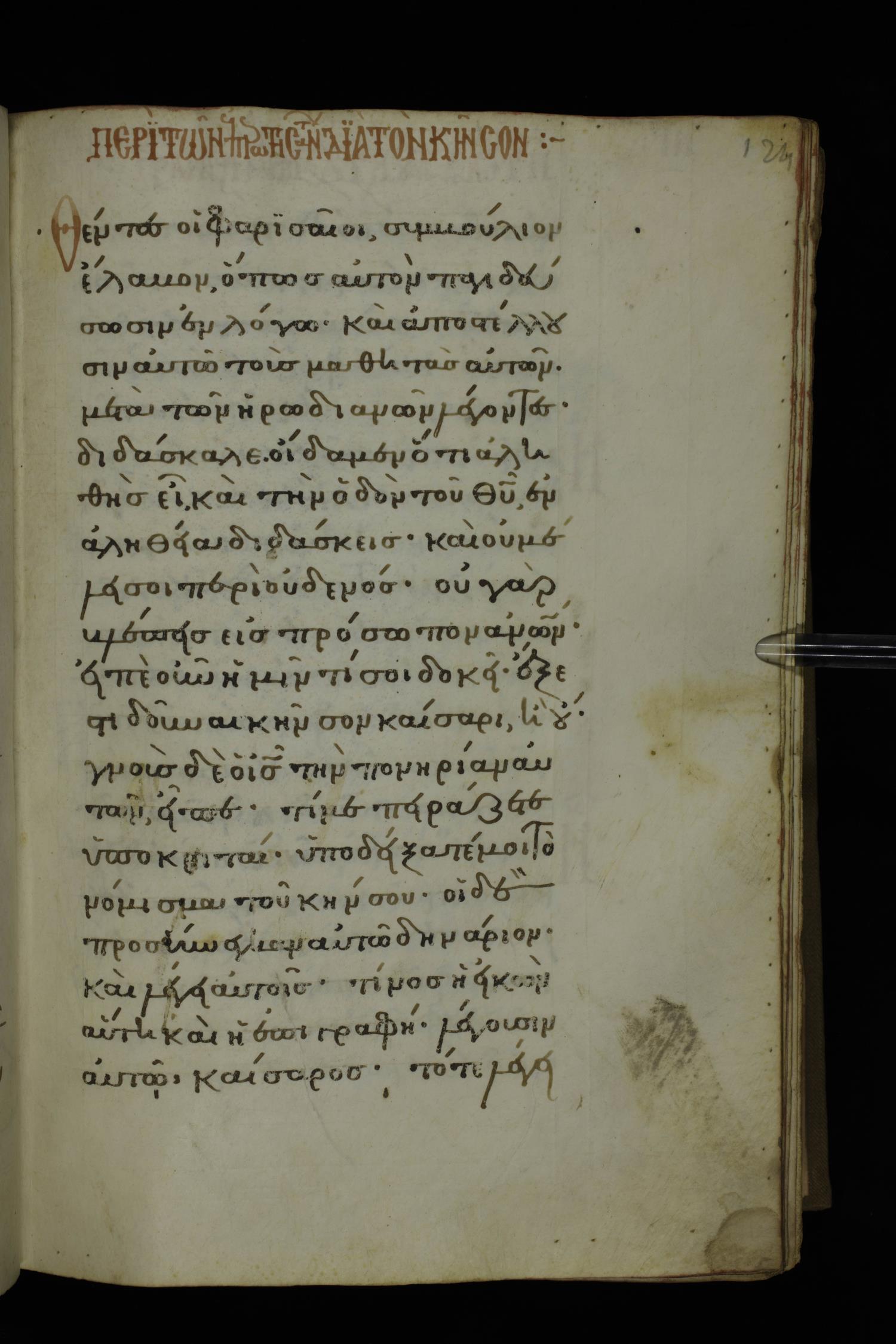 Fourteenth century minuscule of the Gospels on parchment; 332 leaves, 1 column, 20-22 lines per column. Images were taken at the National Library of Greece in Athens.
