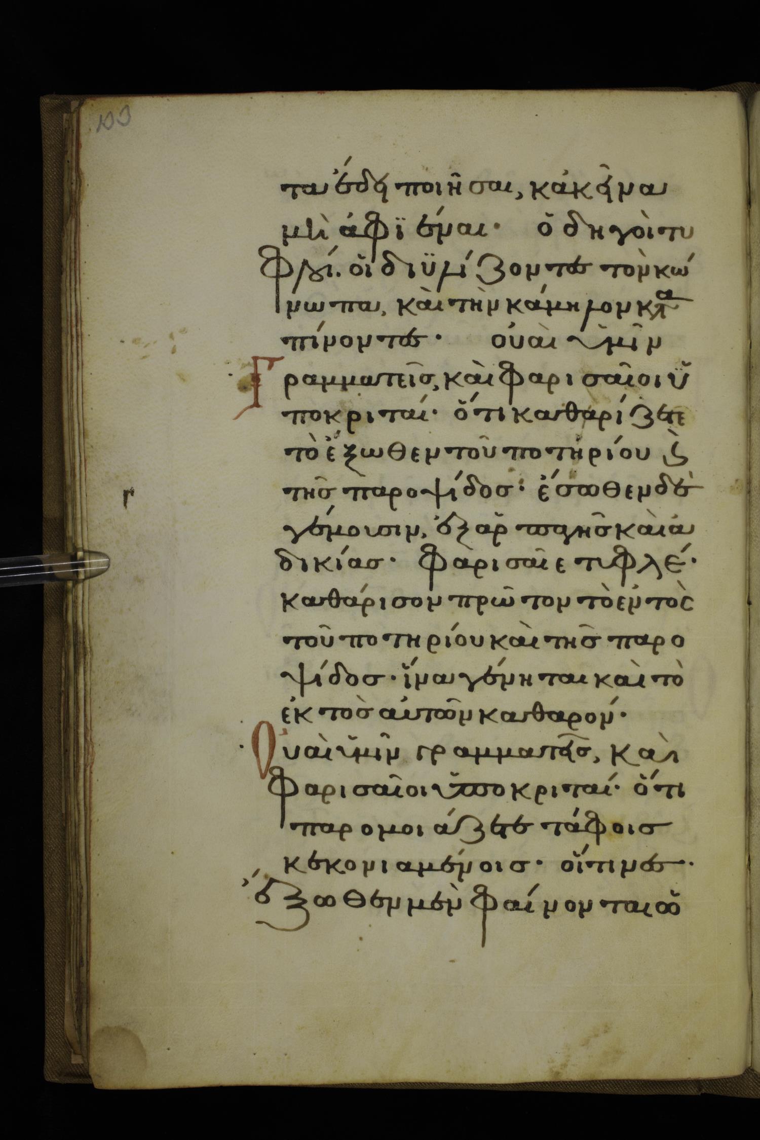 Fourteenth century minuscule of the Gospels on parchment; 332 leaves, 1 column, 20-22 lines per column. Images were taken at the National Library of Greece in Athens.
