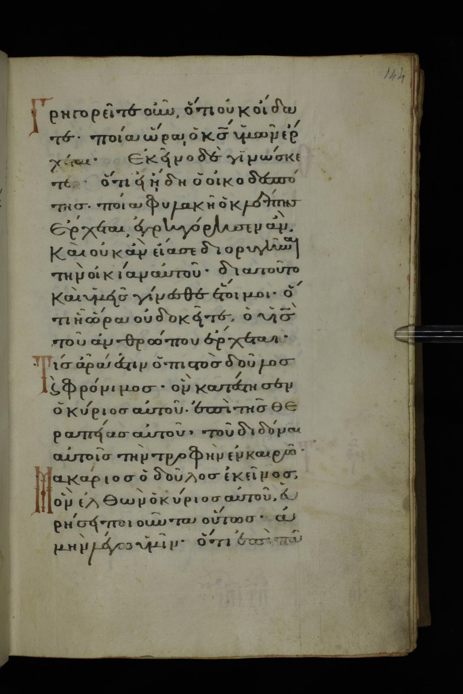 Fourteenth century minuscule of the Gospels on parchment; 332 leaves, 1 column, 20-22 lines per column. Images were taken at the National Library of Greece in Athens.