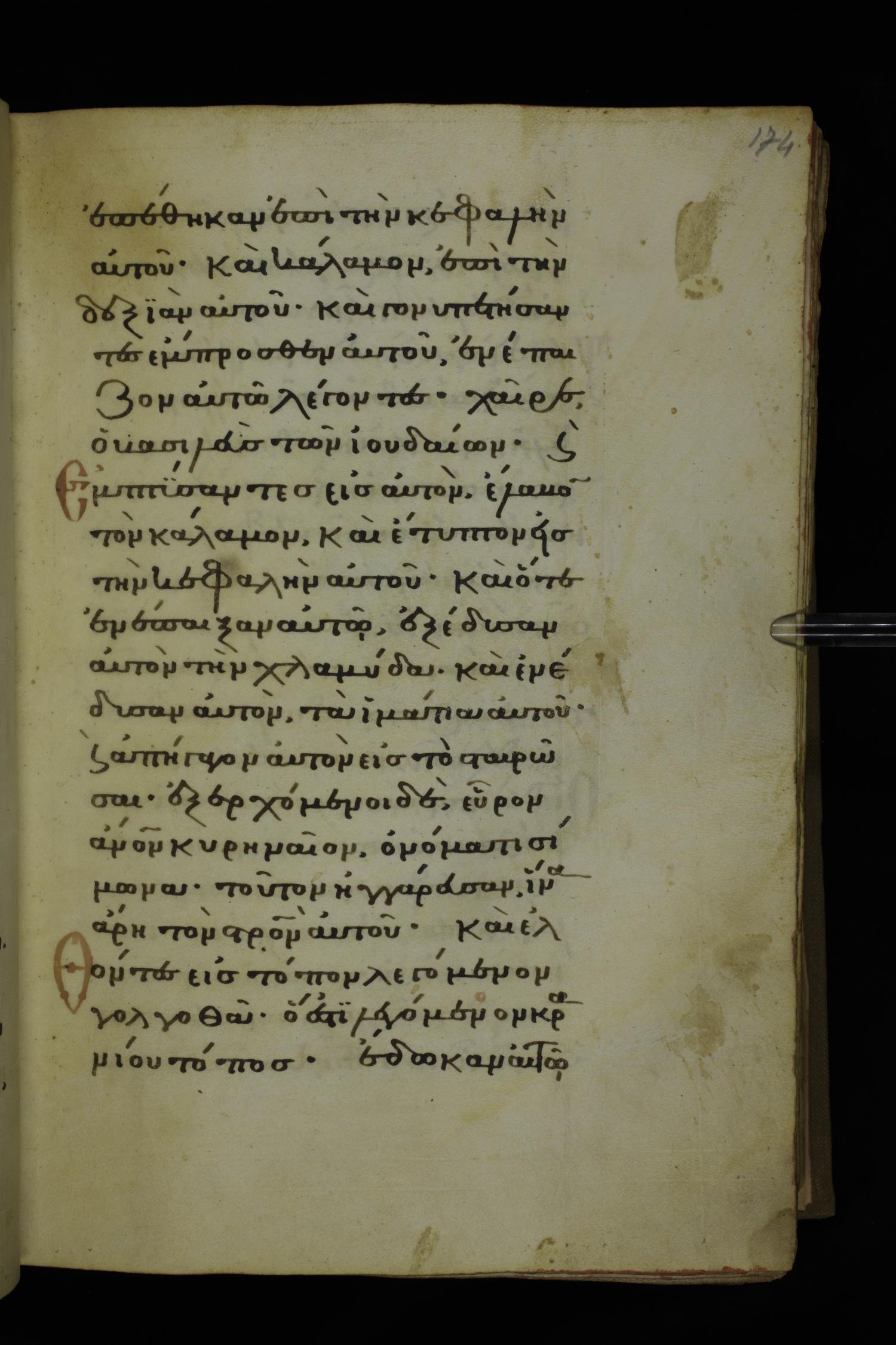 καὶ ἐμπτύσαντες εἰς αὐτὸν ἔλαβον τὸν κάλαμον καὶ ἔτυπτον εἰς τὴν κεφαλὴν αὐτοῦ.