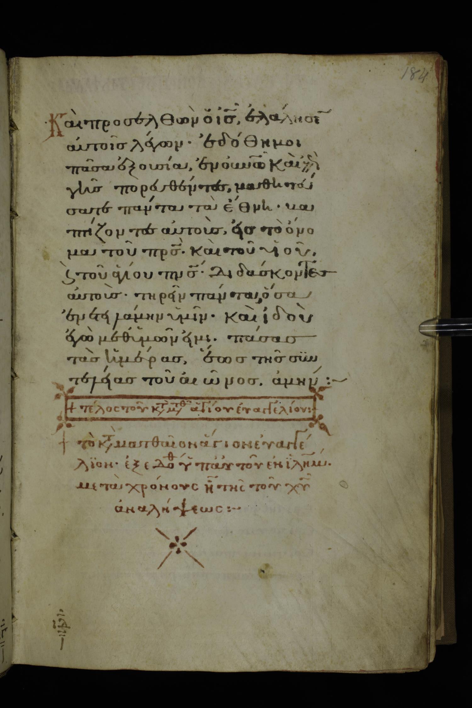 Fourteenth century minuscule of the Gospels on parchment; 332 leaves, 1 column, 20-22 lines per column. Images were taken at the National Library of Greece in Athens.