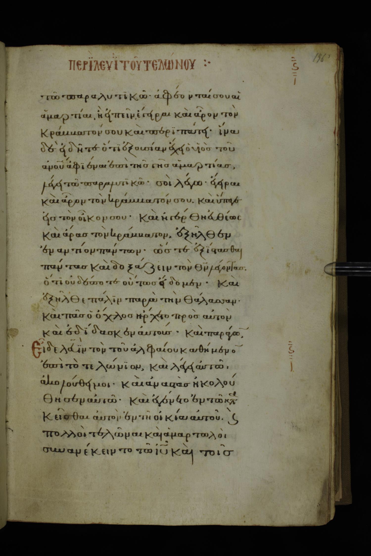 Fourteenth century minuscule of the Gospels on parchment; 332 leaves, 1 column, 20-22 lines per column. Images were taken at the National Library of Greece in Athens.