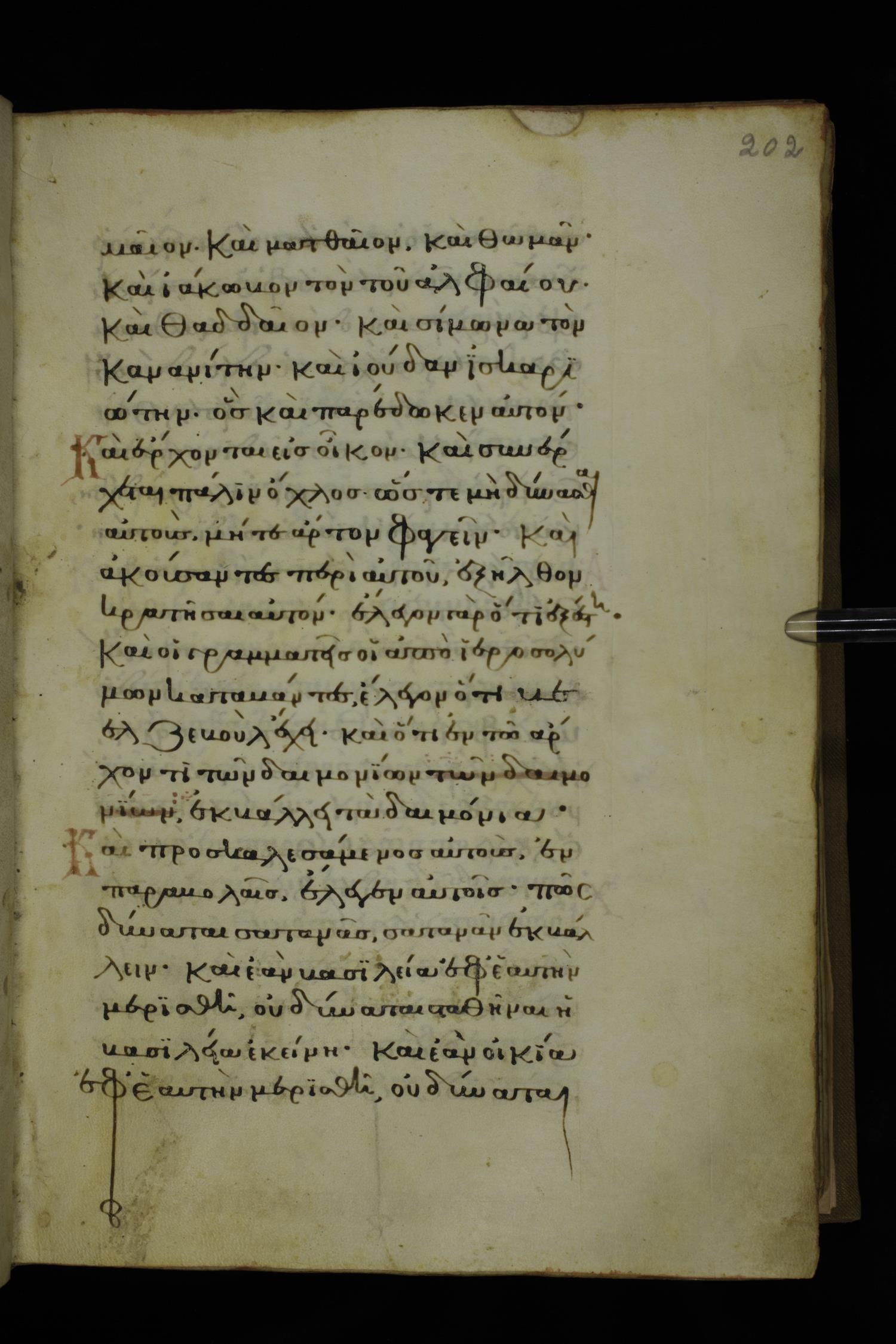 Fourteenth century minuscule of the Gospels on parchment; 332 leaves, 1 column, 20-22 lines per column. Images were taken at the National Library of Greece in Athens.