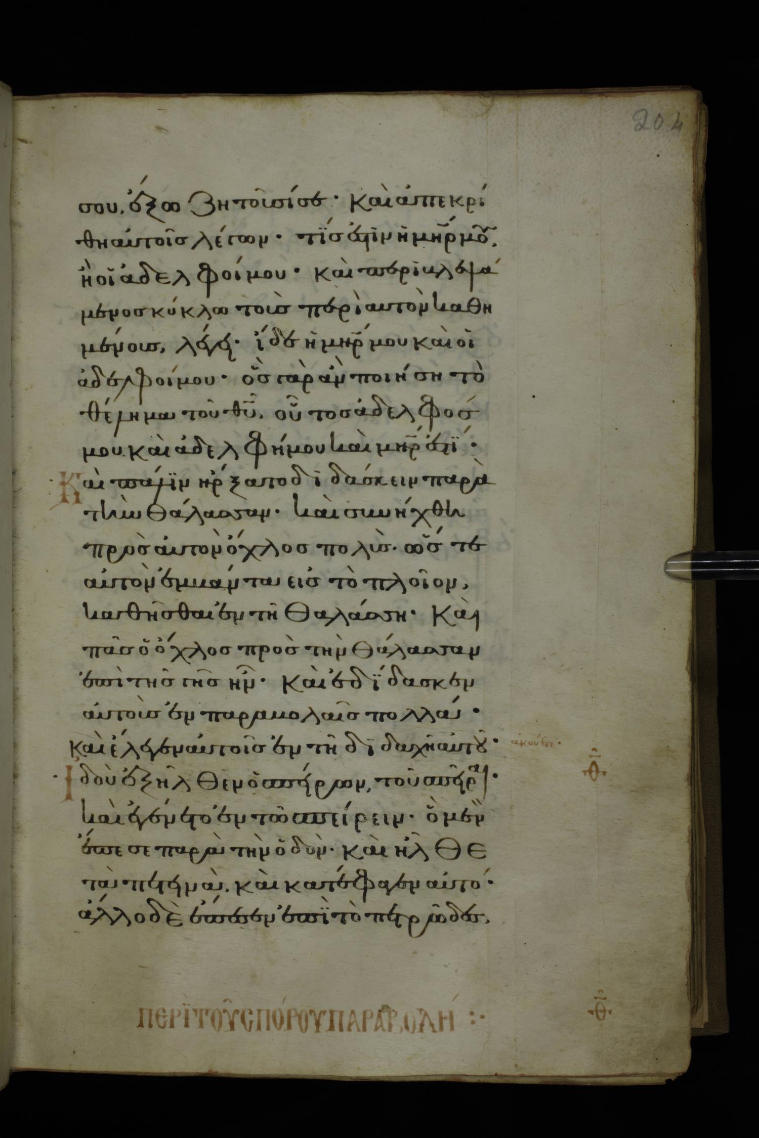 Fourteenth century minuscule of the Gospels on parchment; 332 leaves, 1 column, 20-22 lines per column. Images were taken at the National Library of Greece in Athens.