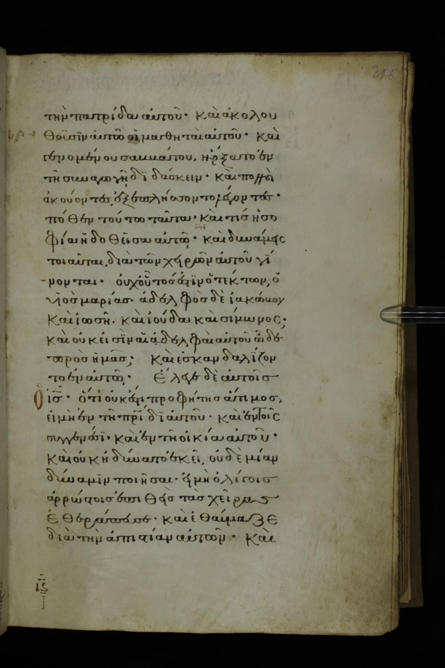 Fourteenth century minuscule of the Gospels on parchment; 332 leaves, 1 column, 20-22 lines per column. Images were taken at the National Library of Greece in Athens.