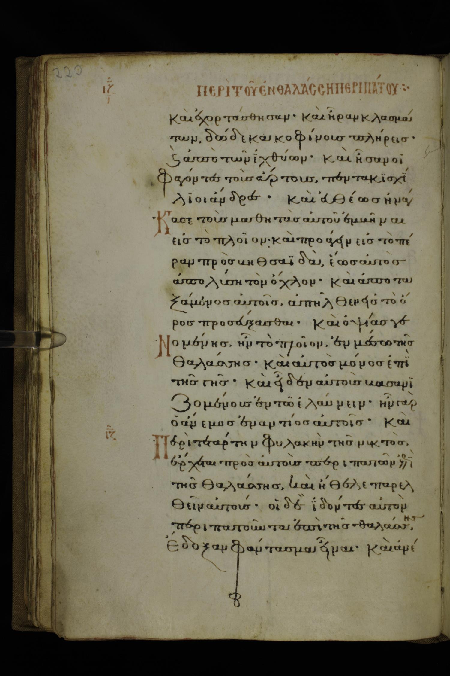 Fourteenth century minuscule of the Gospels on parchment; 332 leaves, 1 column, 20-22 lines per column. Images were taken at the National Library of Greece in Athens.