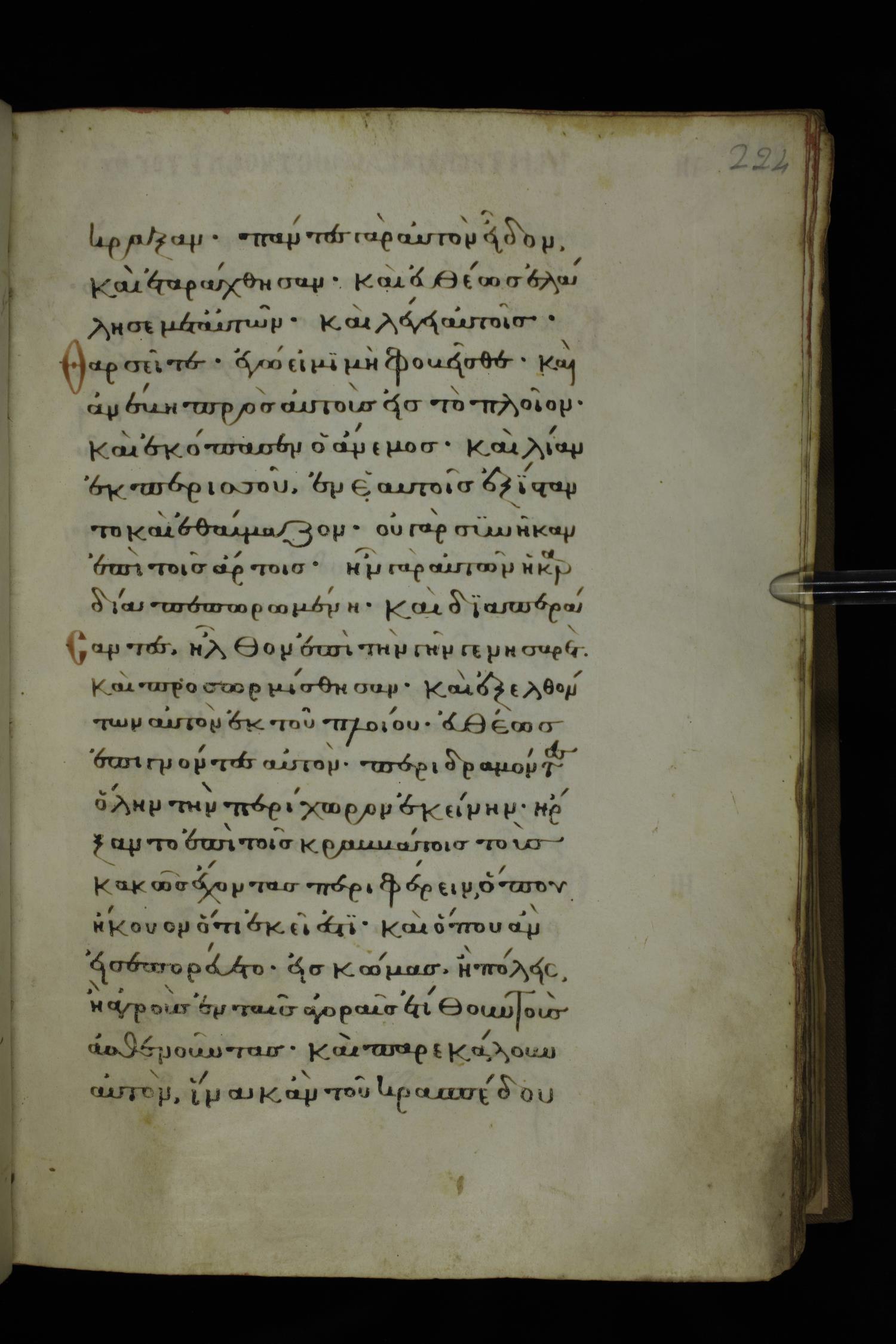Fourteenth century minuscule of the Gospels on parchment; 332 leaves, 1 column, 20-22 lines per column. Images were taken at the National Library of Greece in Athens.