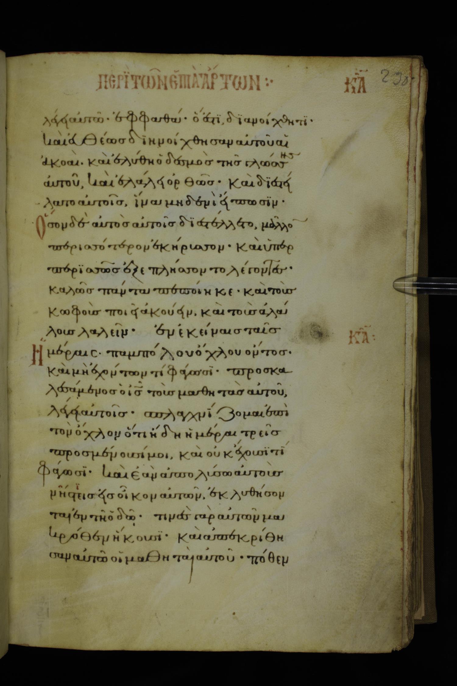 Fourteenth century minuscule of the Gospels on parchment; 332 leaves, 1 column, 20-22 lines per column. Images were taken at the National Library of Greece in Athens.