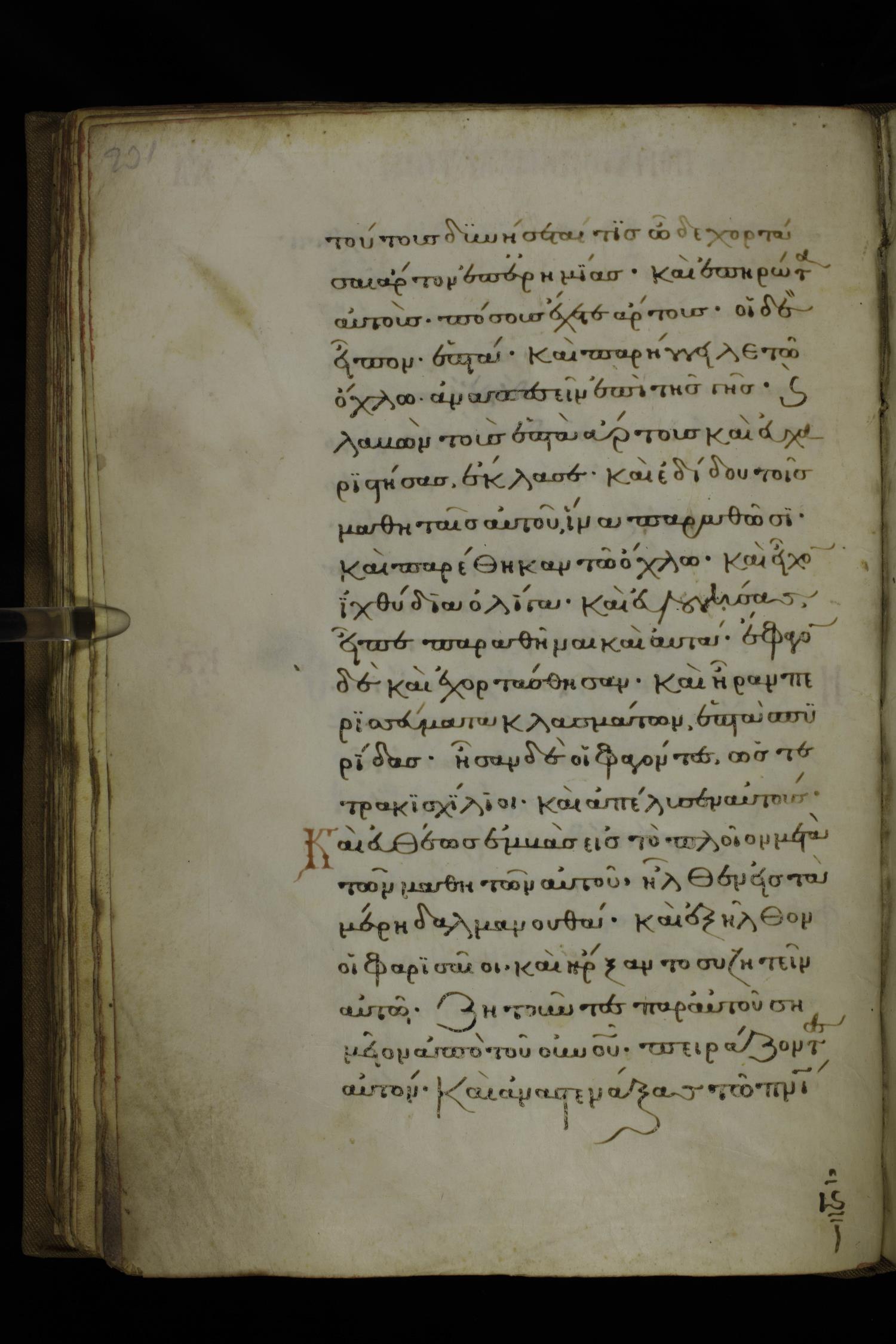 Fourteenth century minuscule of the Gospels on parchment; 332 leaves, 1 column, 20-22 lines per column. Images were taken at the National Library of Greece in Athens.