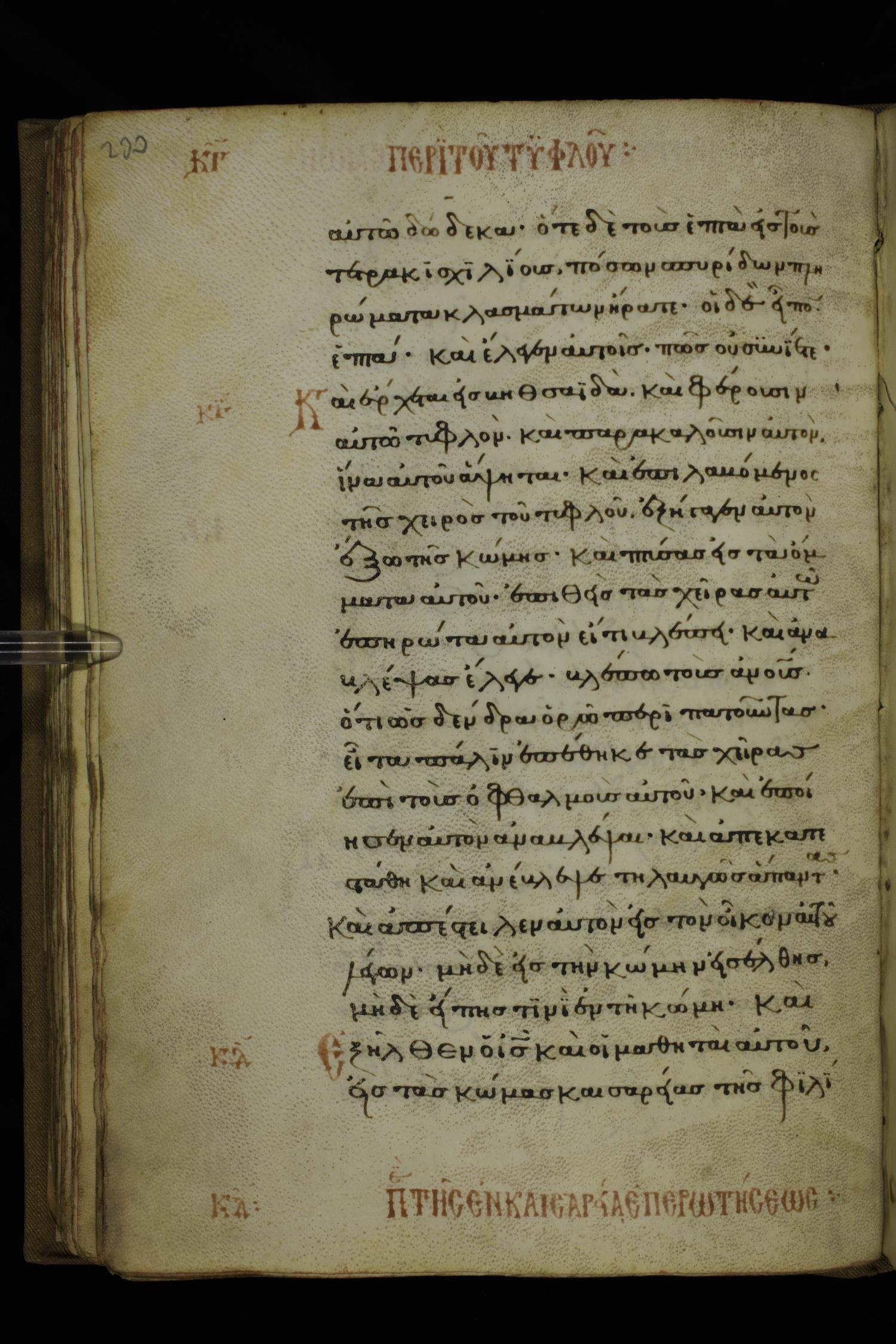 Fourteenth century minuscule of the Gospels on parchment; 332 leaves, 1 column, 20-22 lines per column. Images were taken at the National Library of Greece in Athens.