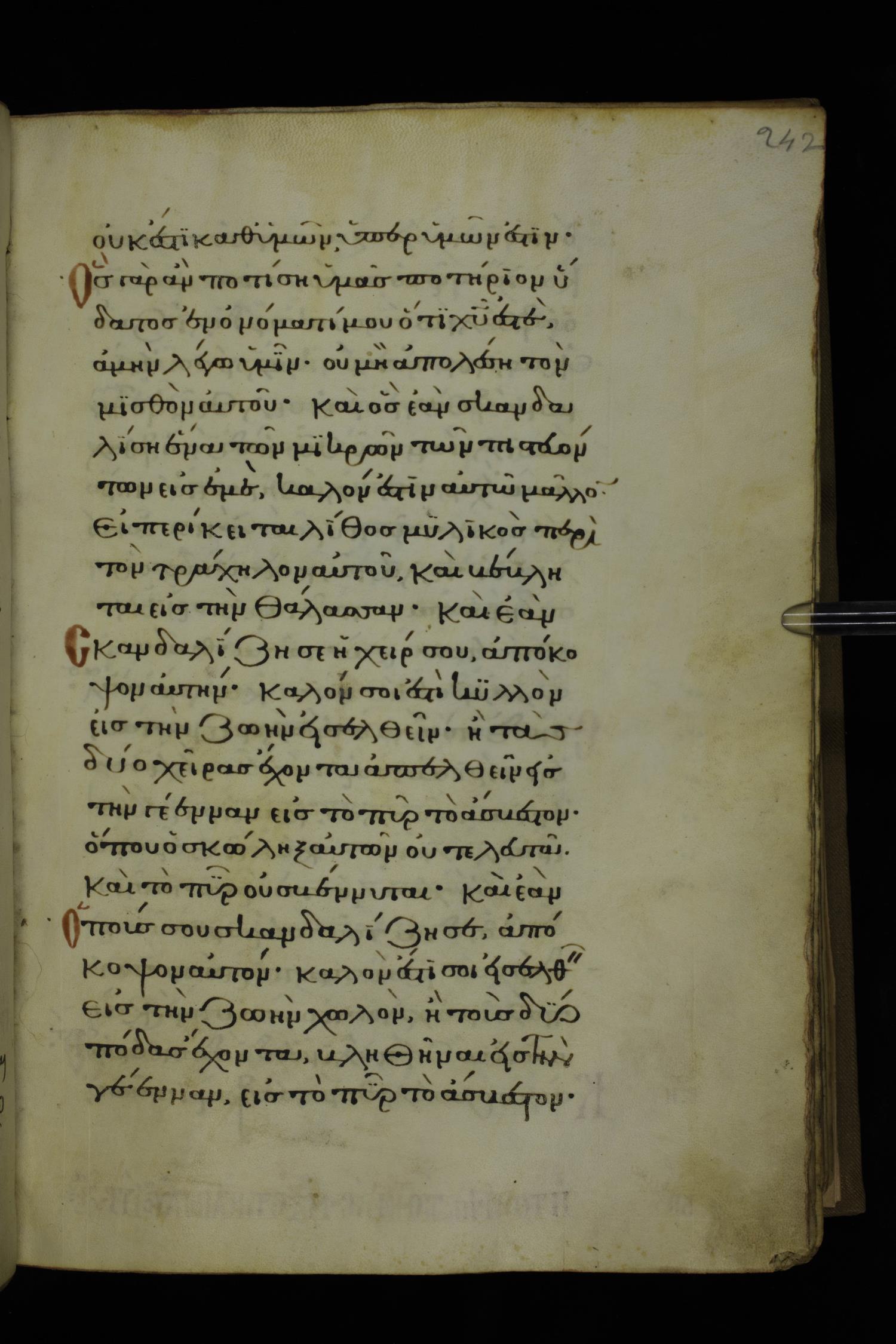Fourteenth century minuscule of the Gospels on parchment; 332 leaves, 1 column, 20-22 lines per column. Images were taken at the National Library of Greece in Athens.