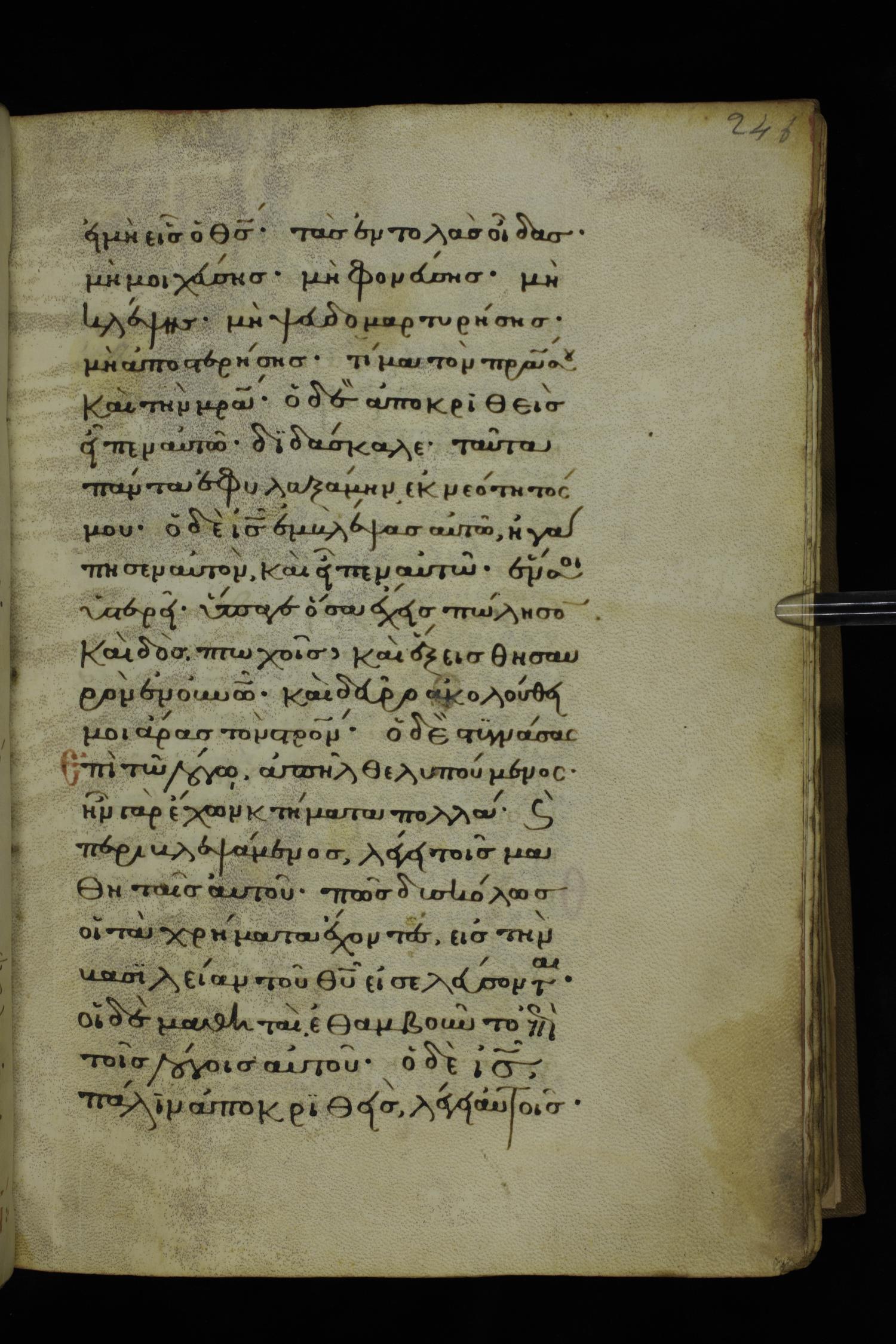 Fourteenth century minuscule of the Gospels on parchment; 332 leaves, 1 column, 20-22 lines per column. Images were taken at the National Library of Greece in Athens.