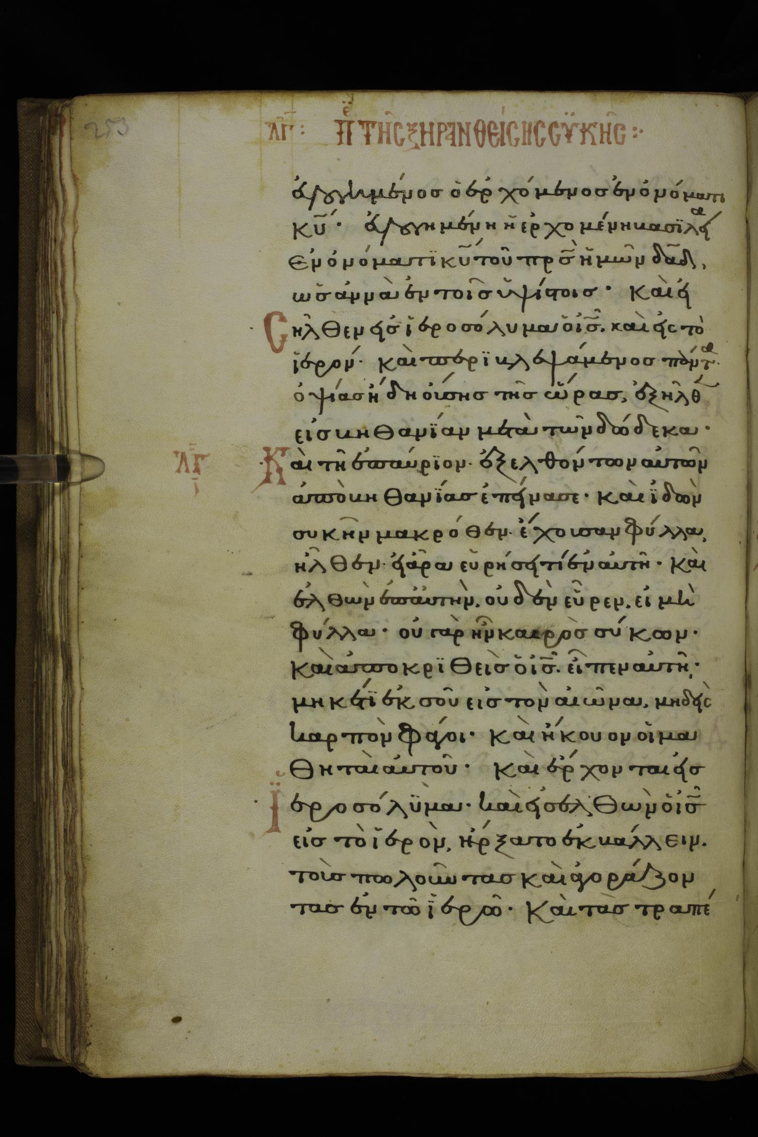 Fourteenth century minuscule of the Gospels on parchment; 332 leaves, 1 column, 20-22 lines per column. Images were taken at the National Library of Greece in Athens.