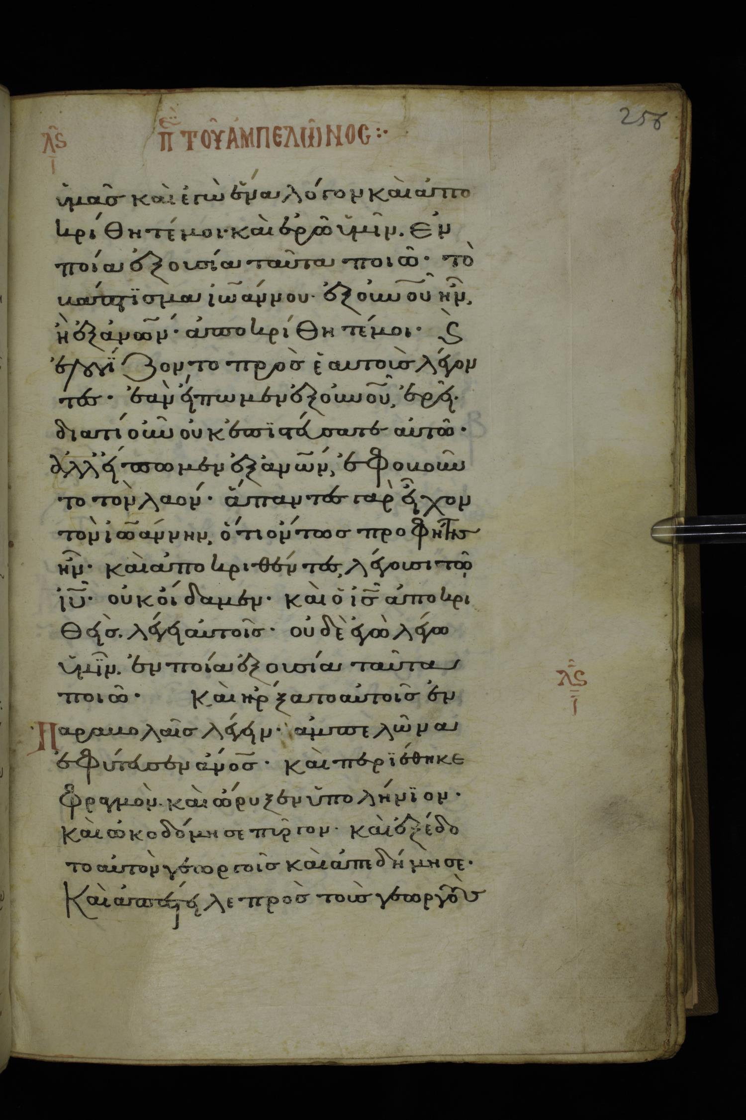 Fourteenth century minuscule of the Gospels on parchment; 332 leaves, 1 column, 20-22 lines per column. Images were taken at the National Library of Greece in Athens.