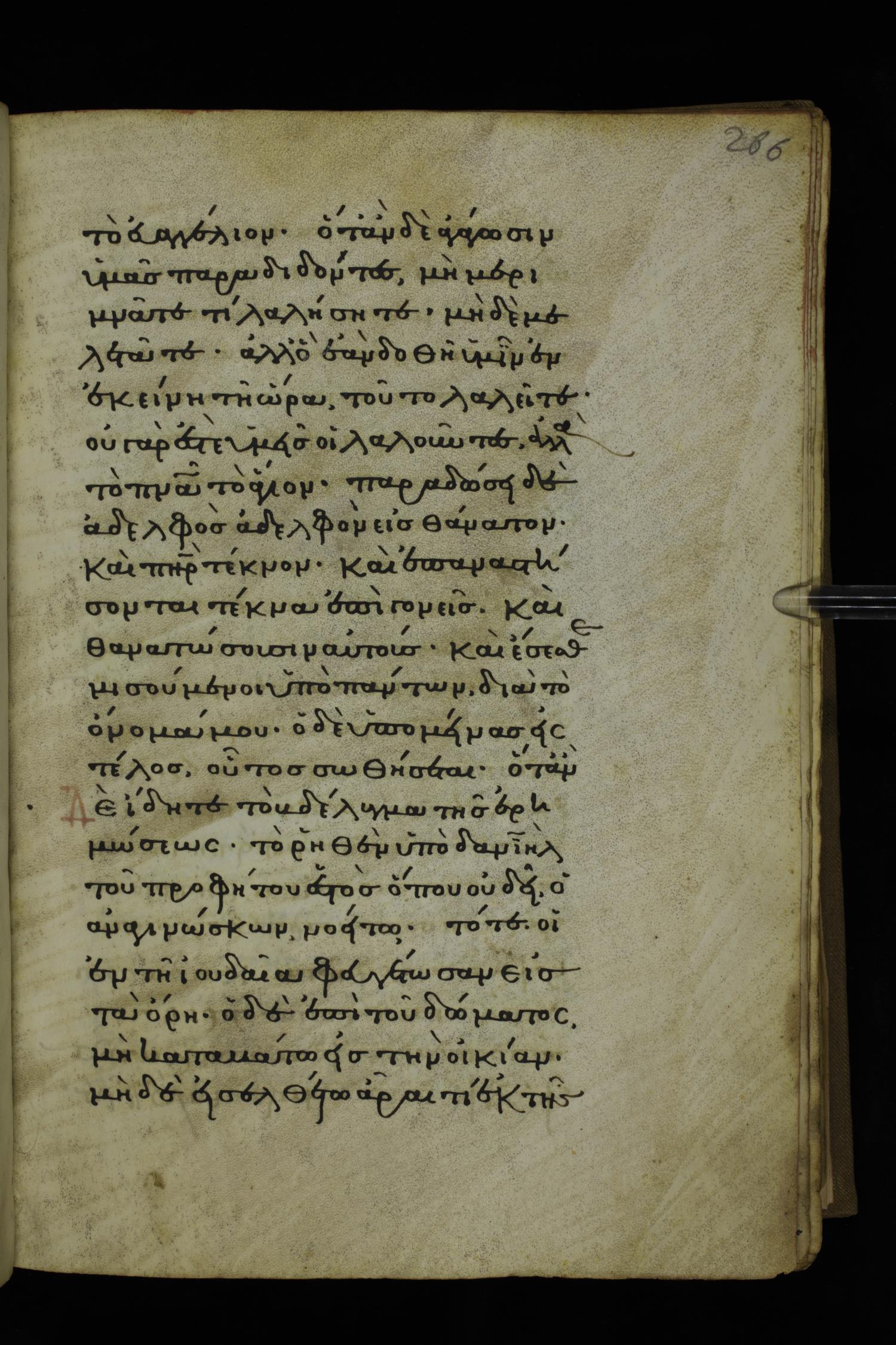 Fourteenth century minuscule of the Gospels on parchment; 332 leaves, 1 column, 20-22 lines per column. Images were taken at the National Library of Greece in Athens.