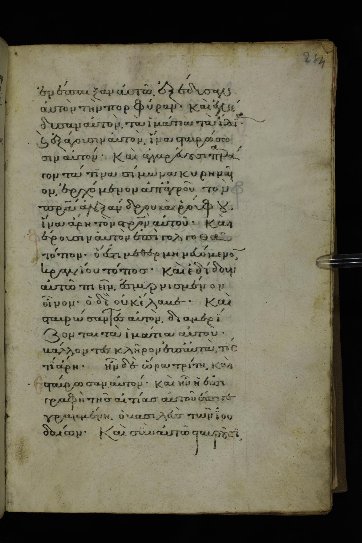 Fourteenth century minuscule of the Gospels on parchment; 332 leaves, 1 column, 20-22 lines per column. Images were taken at the National Library of Greece in Athens.