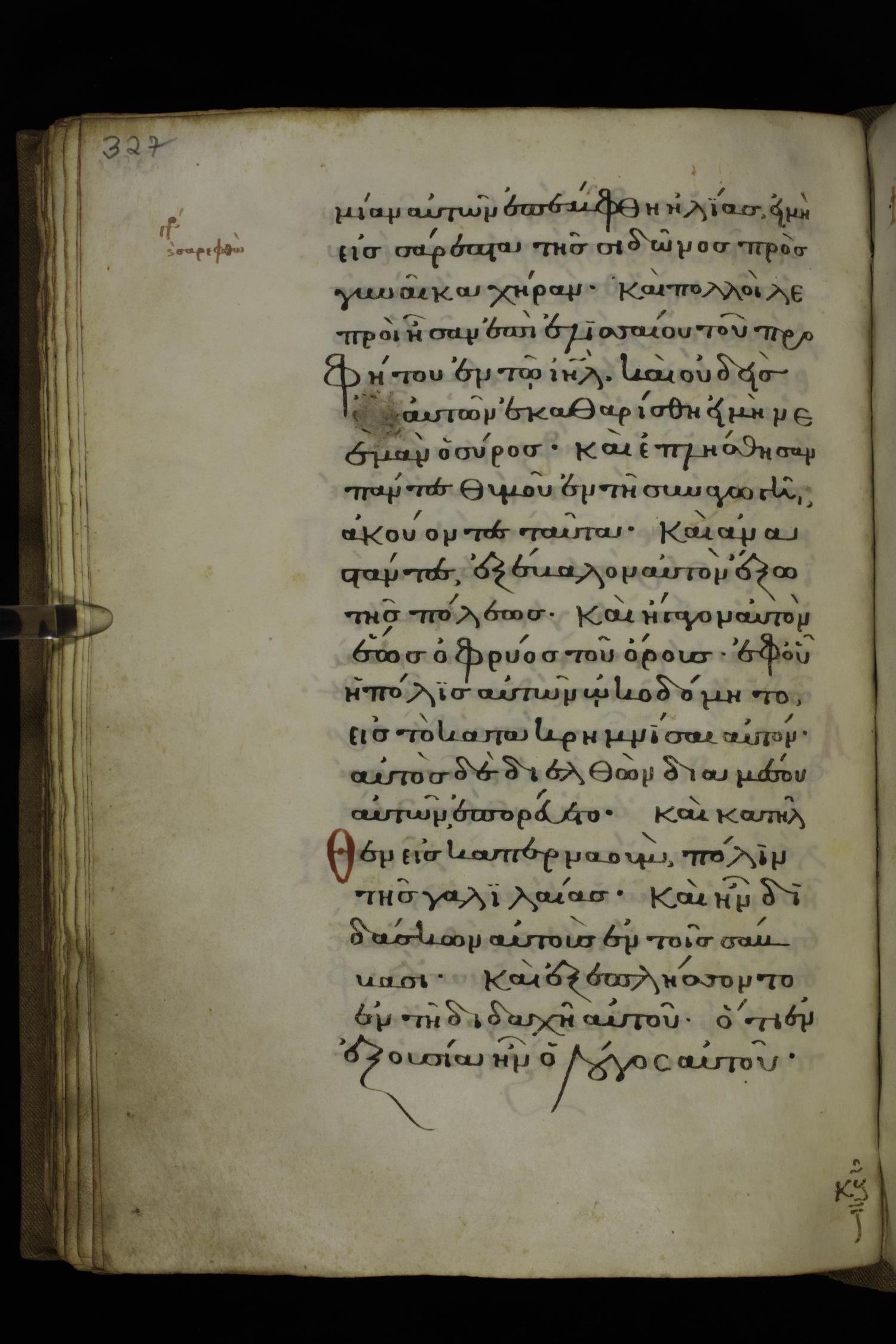 Fourteenth century minuscule of the Gospels on parchment; 332 leaves, 1 column, 20-22 lines per column. Images were taken at the National Library of Greece in Athens.