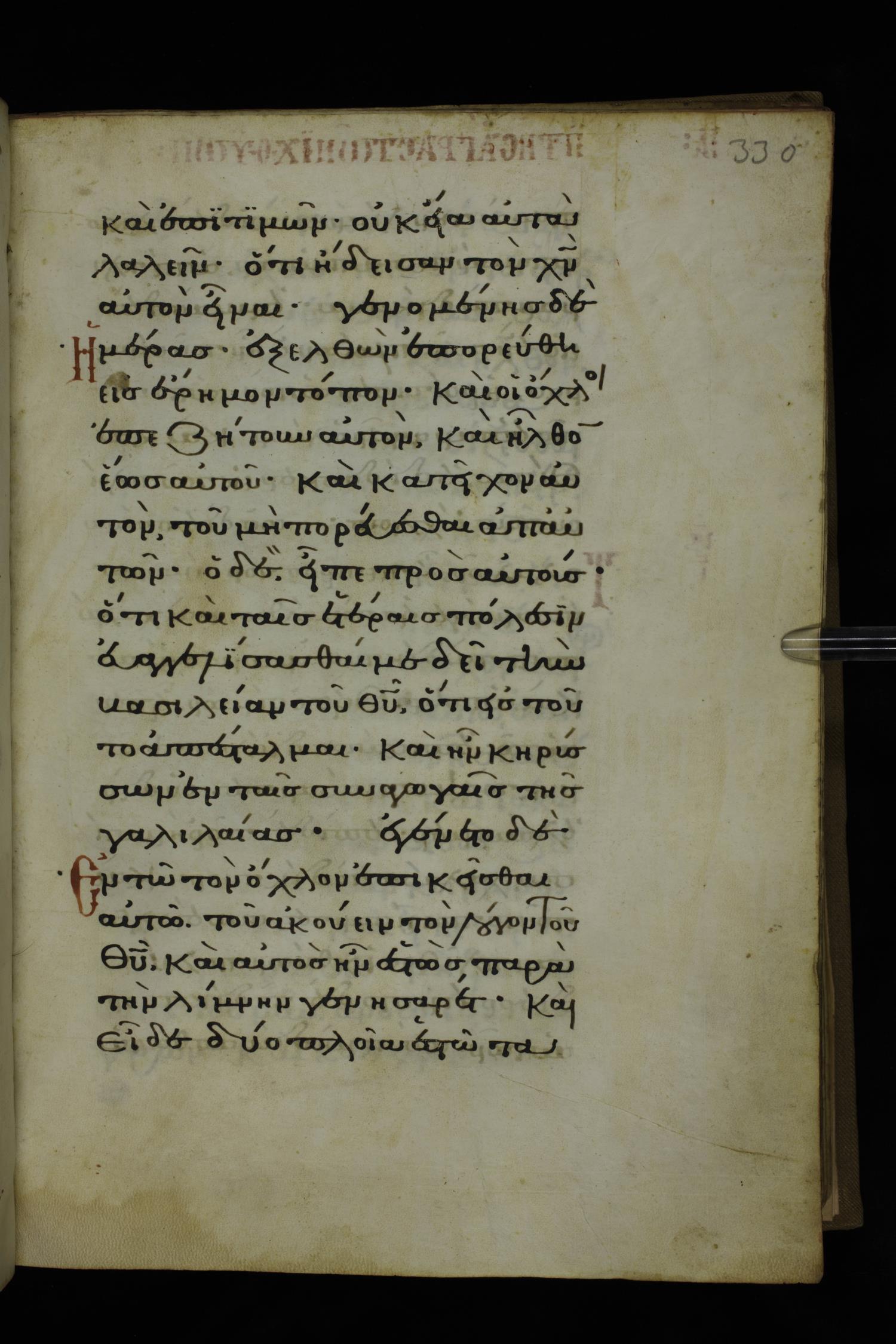 Fourteenth century minuscule of the Gospels on parchment; 332 leaves, 1 column, 20-22 lines per column. Images were taken at the National Library of Greece in Athens.
