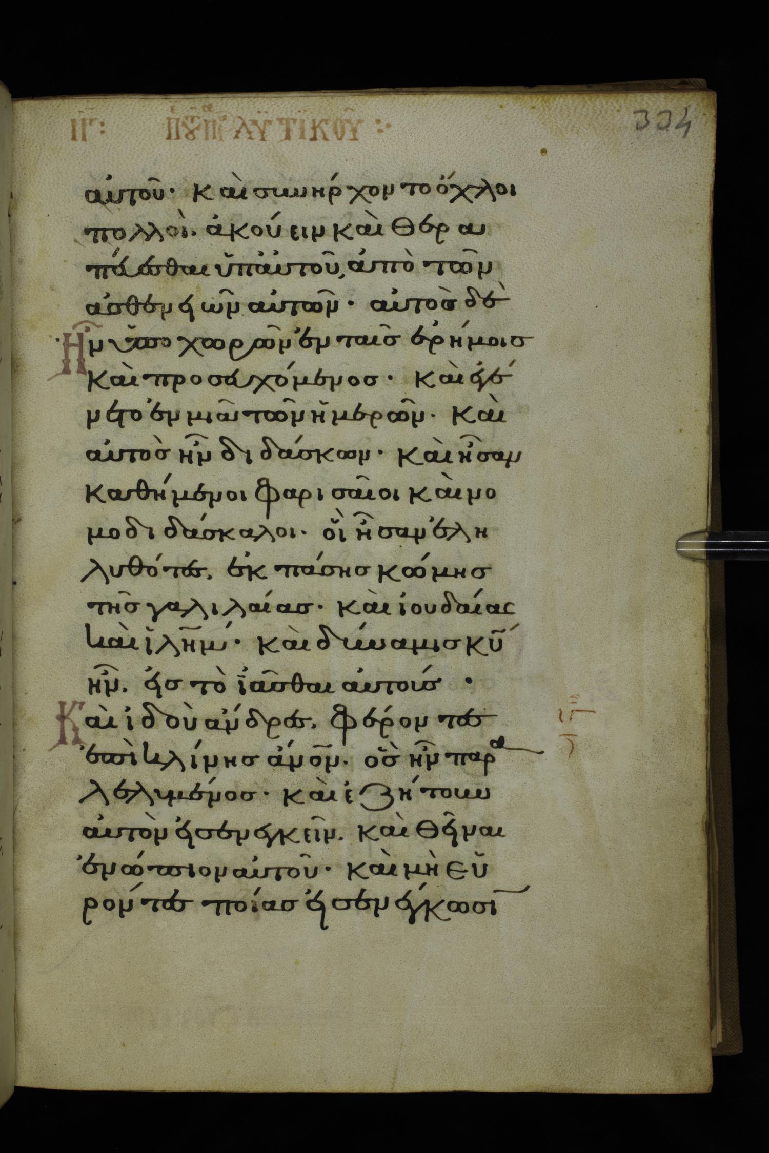 Fourteenth century minuscule of the Gospels on parchment; 332 leaves, 1 column, 20-22 lines per column. Images were taken at the National Library of Greece in Athens.